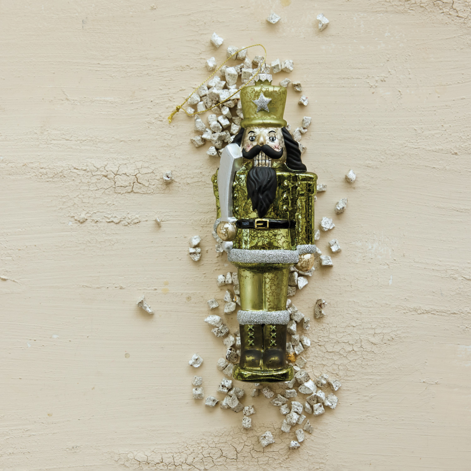 Glass Soldier Ornament with Glitter, Silver Finish & Green ©