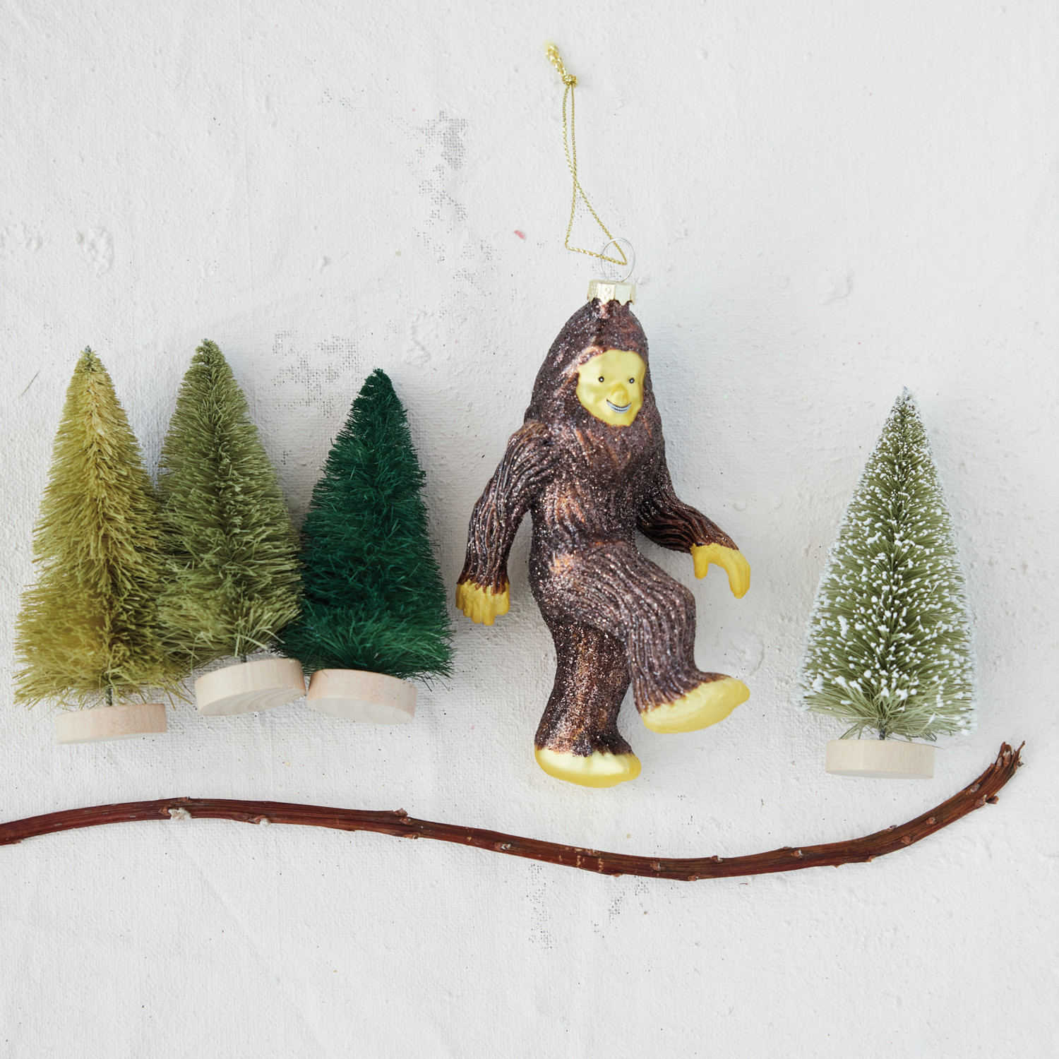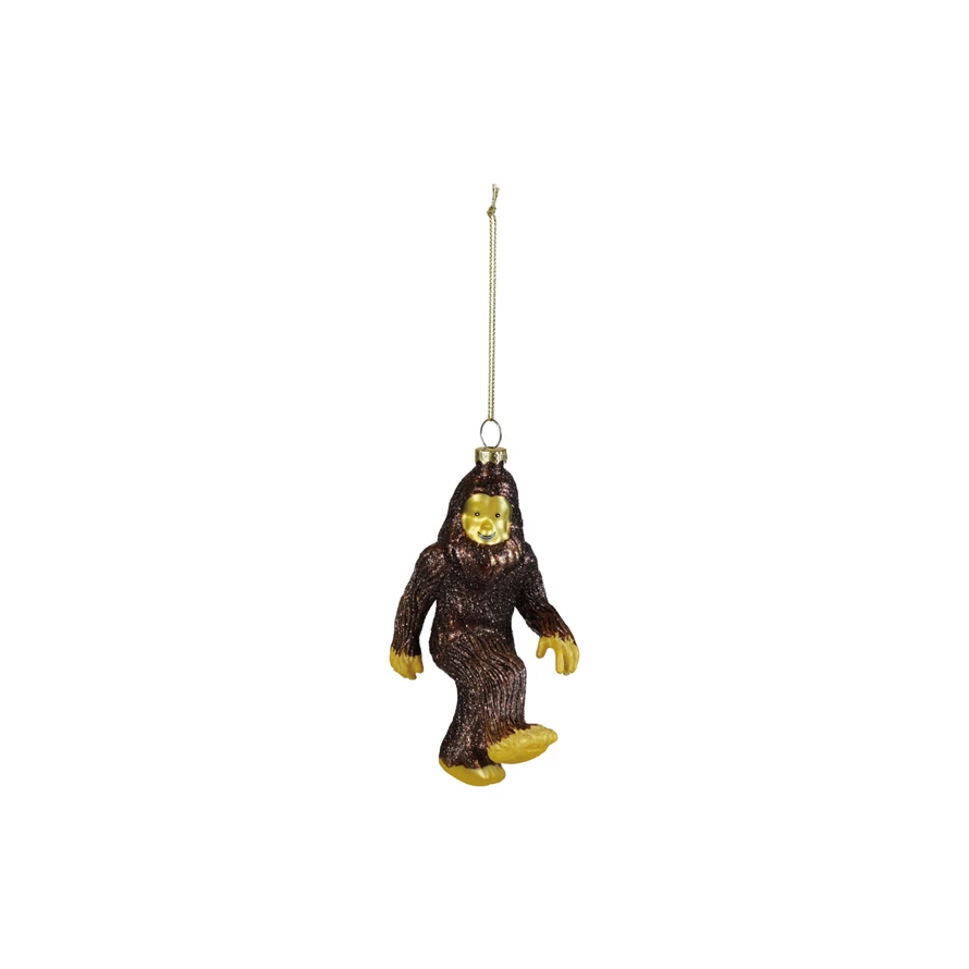 Hand-Painted Glass Bigfoot Ornament with Glitter, Brown & Yellow