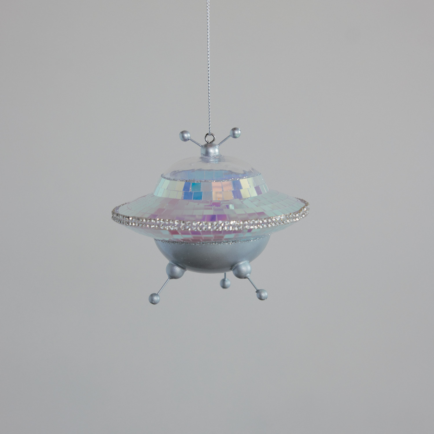 Glass Spaceship Ornament with Glitter & Jewels, Silver Finish