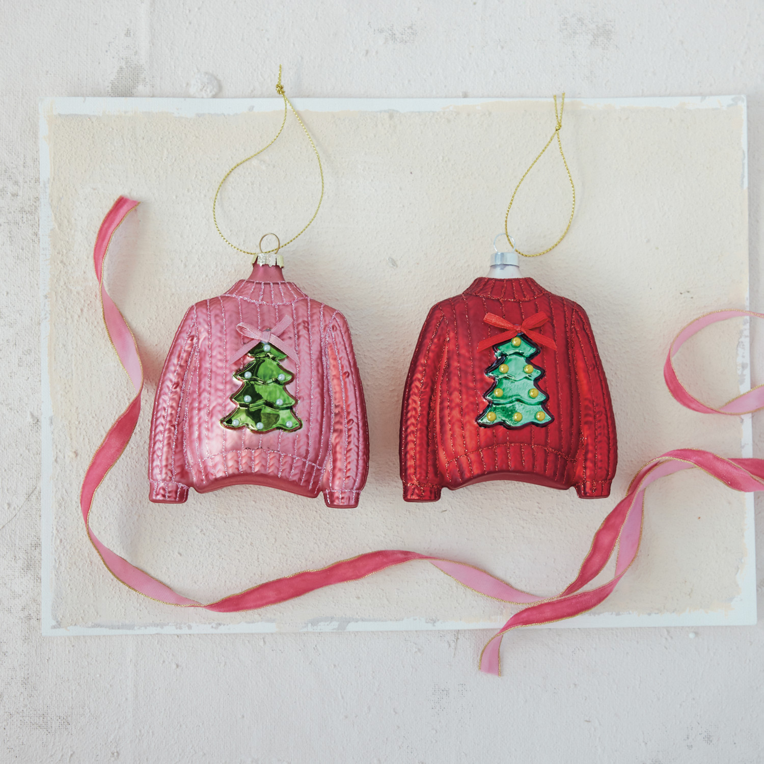 Hand-Painted Glass Sweater Ornament with Tree & Bow, 2 Colors