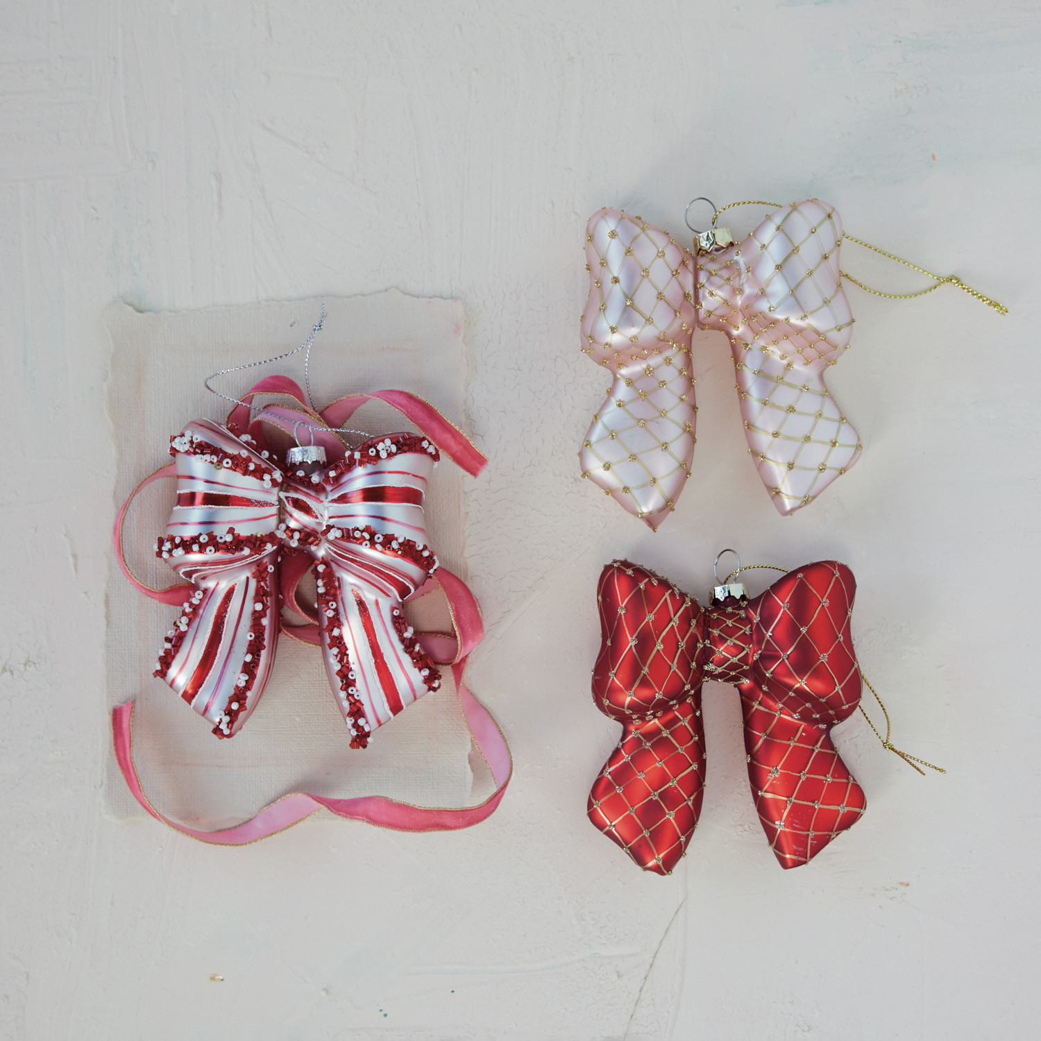 Hand-Painted Glass Candy Striped Bow Ornament with Beads, Red & White
