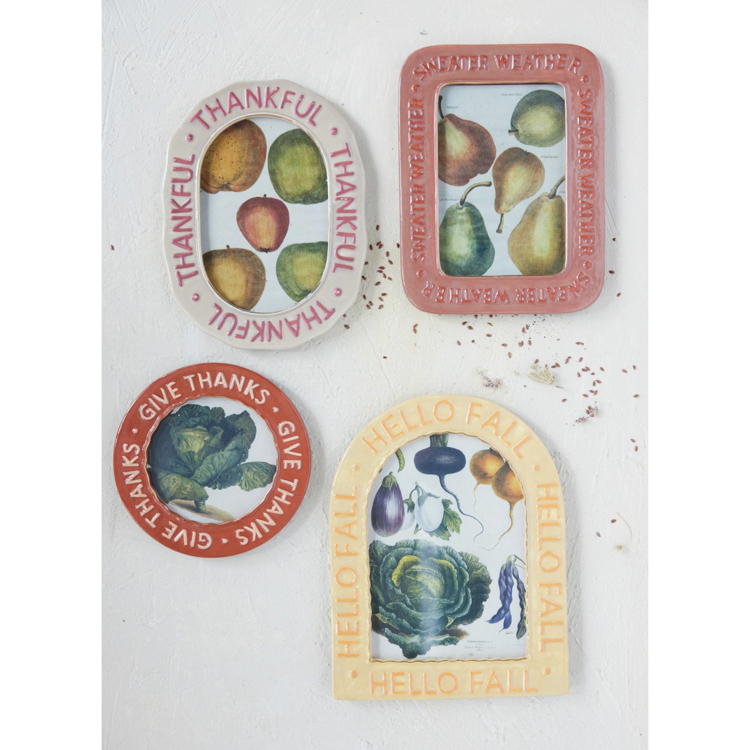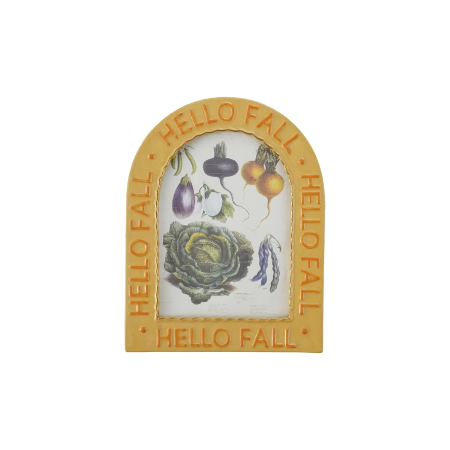 Catalog Name: 7-1/4"W x 9-1/4"H Hand-Painted Embossed Stoneware Arched Photo Frame "Hello Fall", Yellow & Orange Color (Holds 5" x 7" Photo)