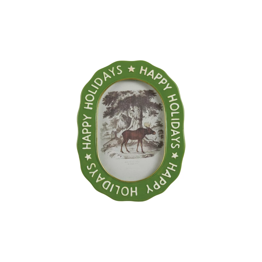 Catalog Name: 6"W x 8"H Oval Hand-Painted Embossed Stoneware Photo Frame "Happy Holidays", Green & White (Holds 4" x 6" Photo)