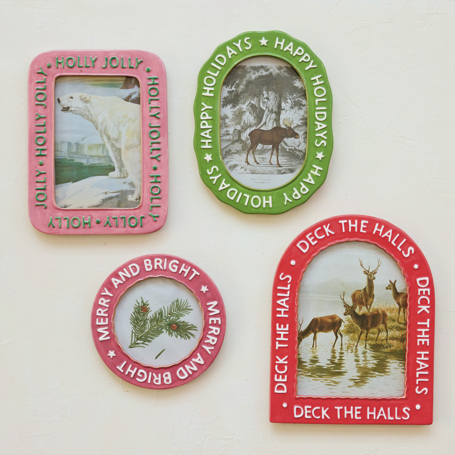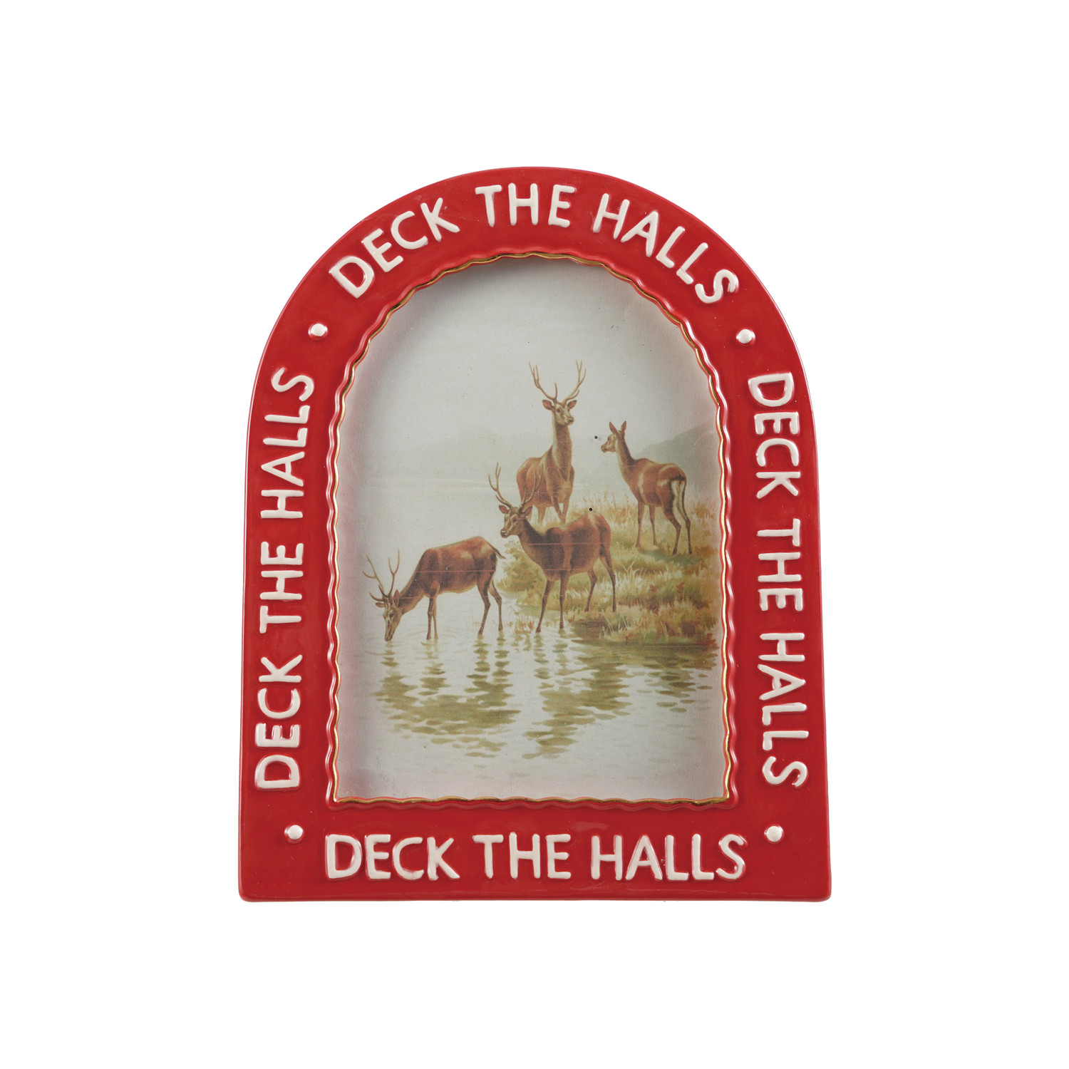 Catalog Name: 7-1/4"W x 9-1/4"H Hand-Painted Embossed Stoneware Arched Photo Frame "Deck The Halls", Red & White (Holds 5" x 7" Photo)