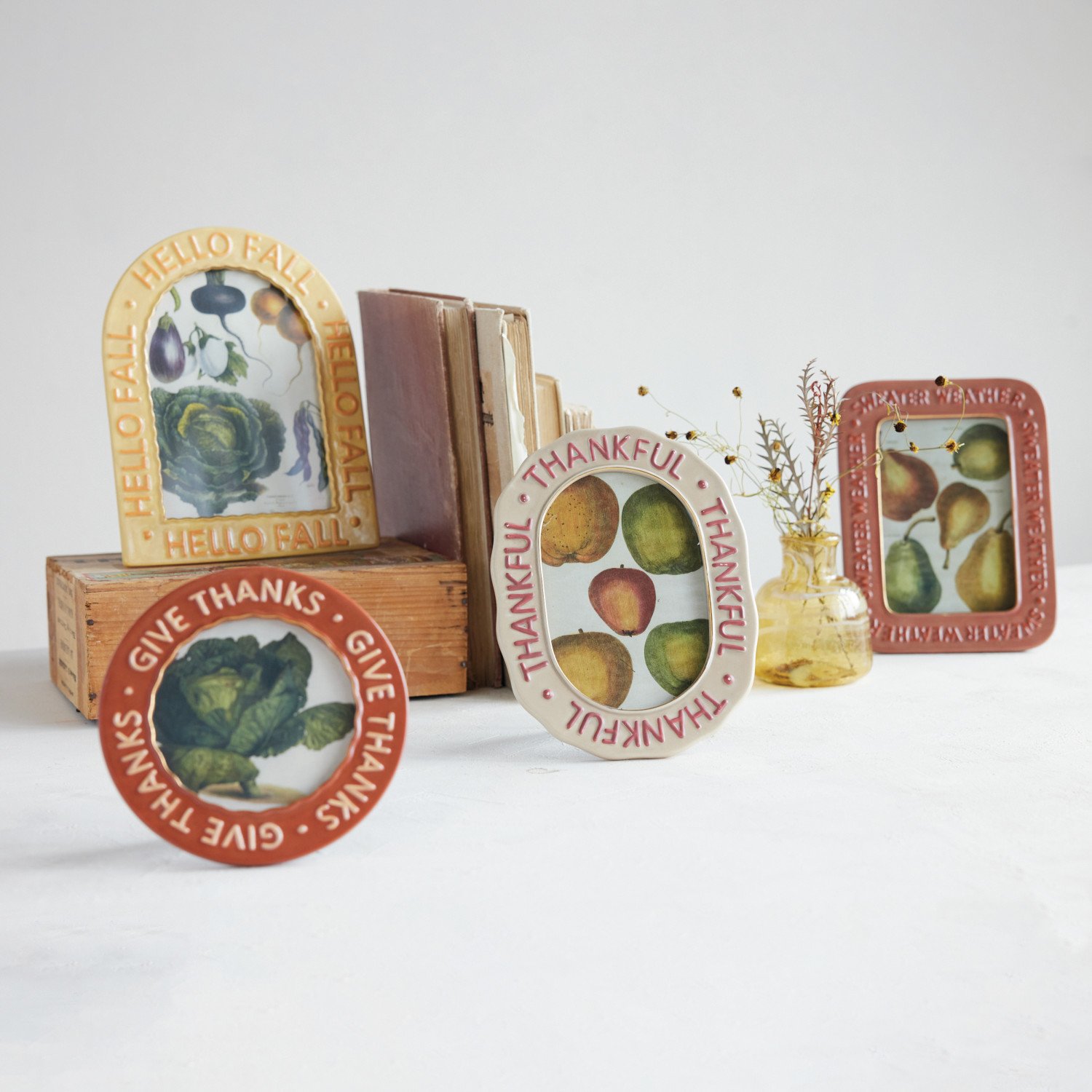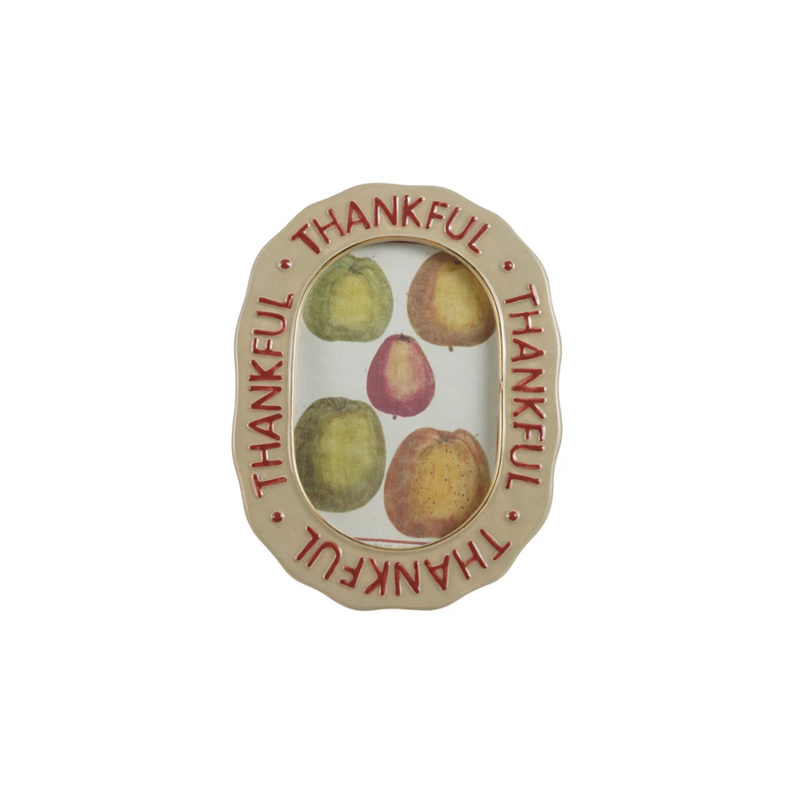 Catalog Name: 6"W x 8"H Oval Hand-Painted Embossed Stoneware Photo Frame "Thankful", Cream Color & Brown (Holds 4-1/4" x 6-1/4" Photo)