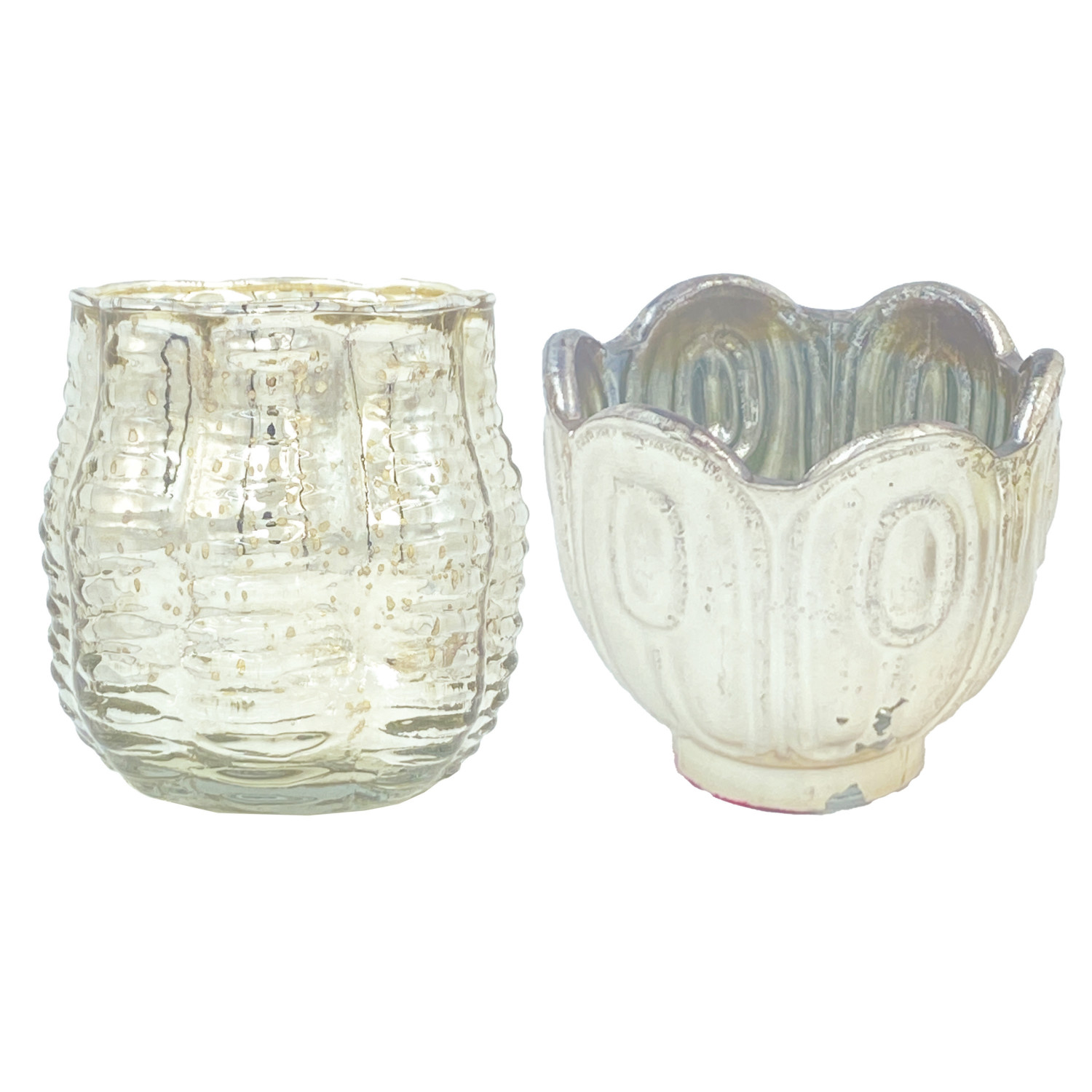 Catalog Name: 2-1/2"H - 3-1/2"H Embossed Mercury Glass Scalloped Tealight/Votive Holder, Silver Finish, 2 Styles