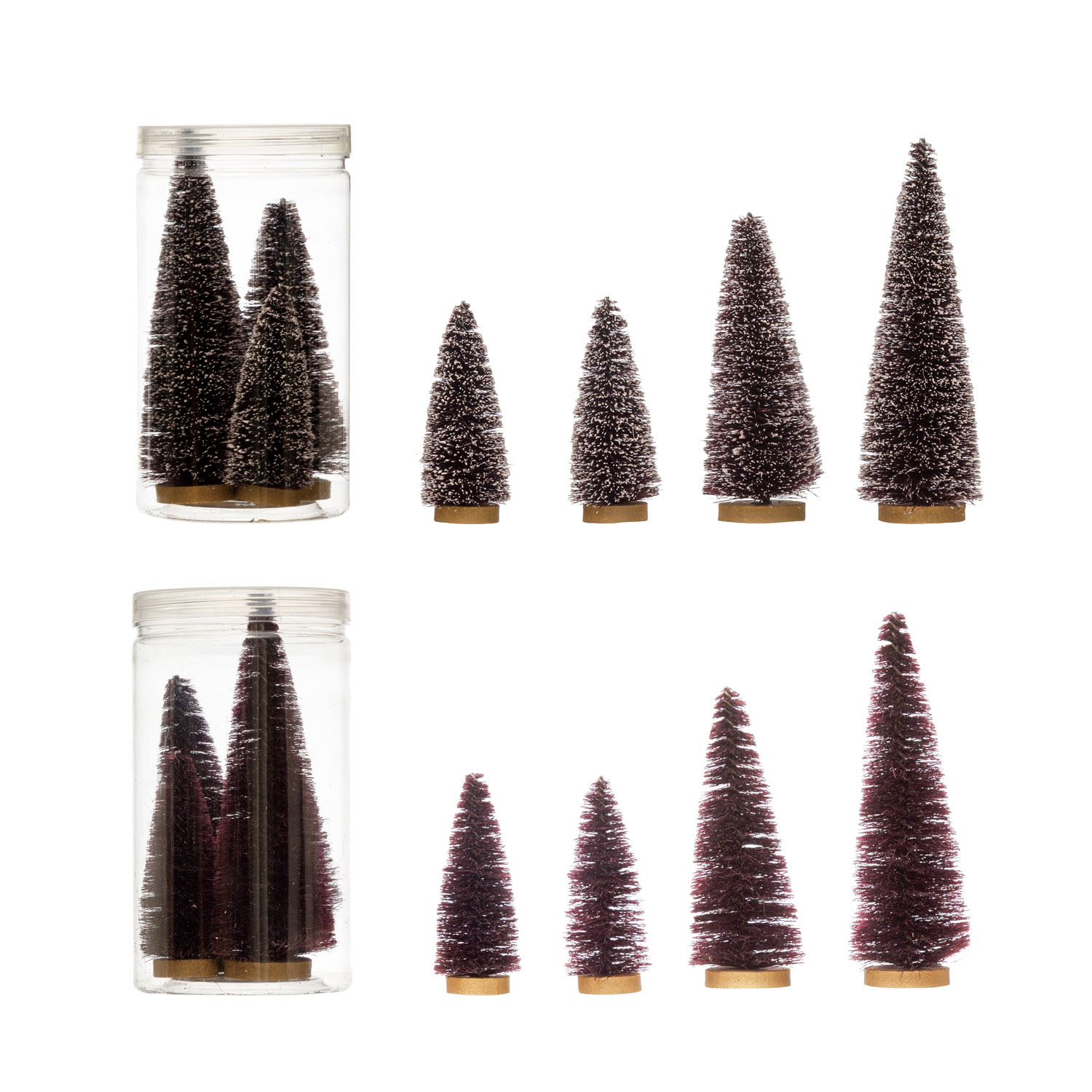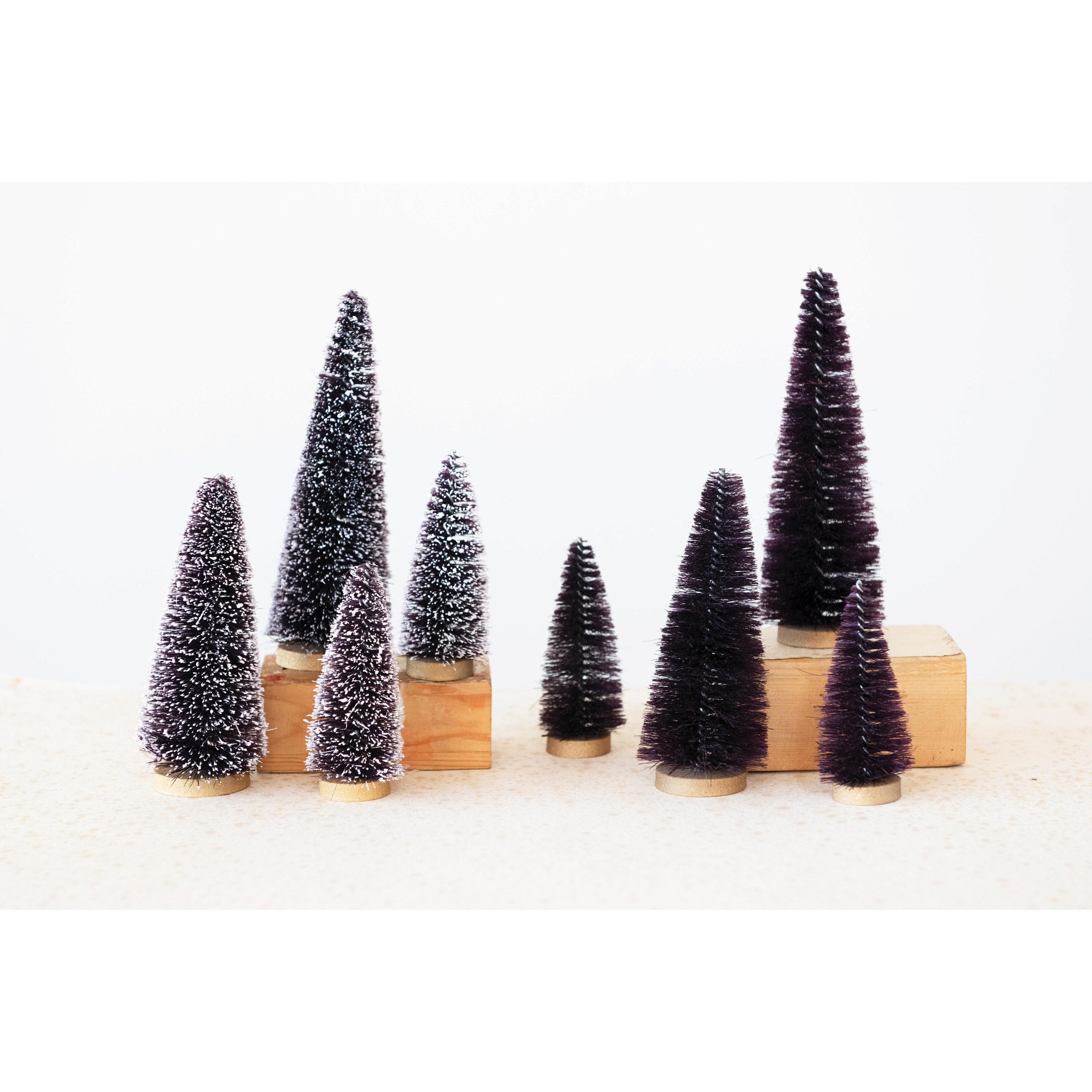 Catalog Name: 3-3/4"H - 6-3/4"H Bottle Brush Trees with Wood Bases, Purple, Boxed Set of 4, 2 Finishes
