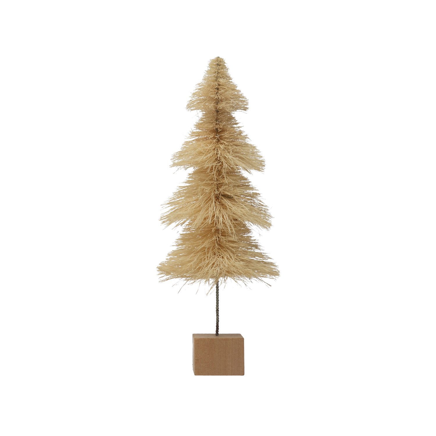 Cream colored Sisal bottle brush tree with wood base; Add to a seasonal display for a dash of whimsical holiday charm; Made from 80% Sisal, 20% Schima. Add to a seasonal display for a dash of whimsical holiday charm.
