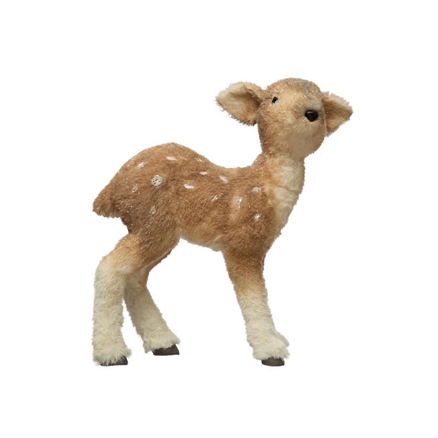 9-3/4"L x 6-1/4"W x 12-1/4"H Faux Fur Standing Fawn with Glitter, Tan Color and White