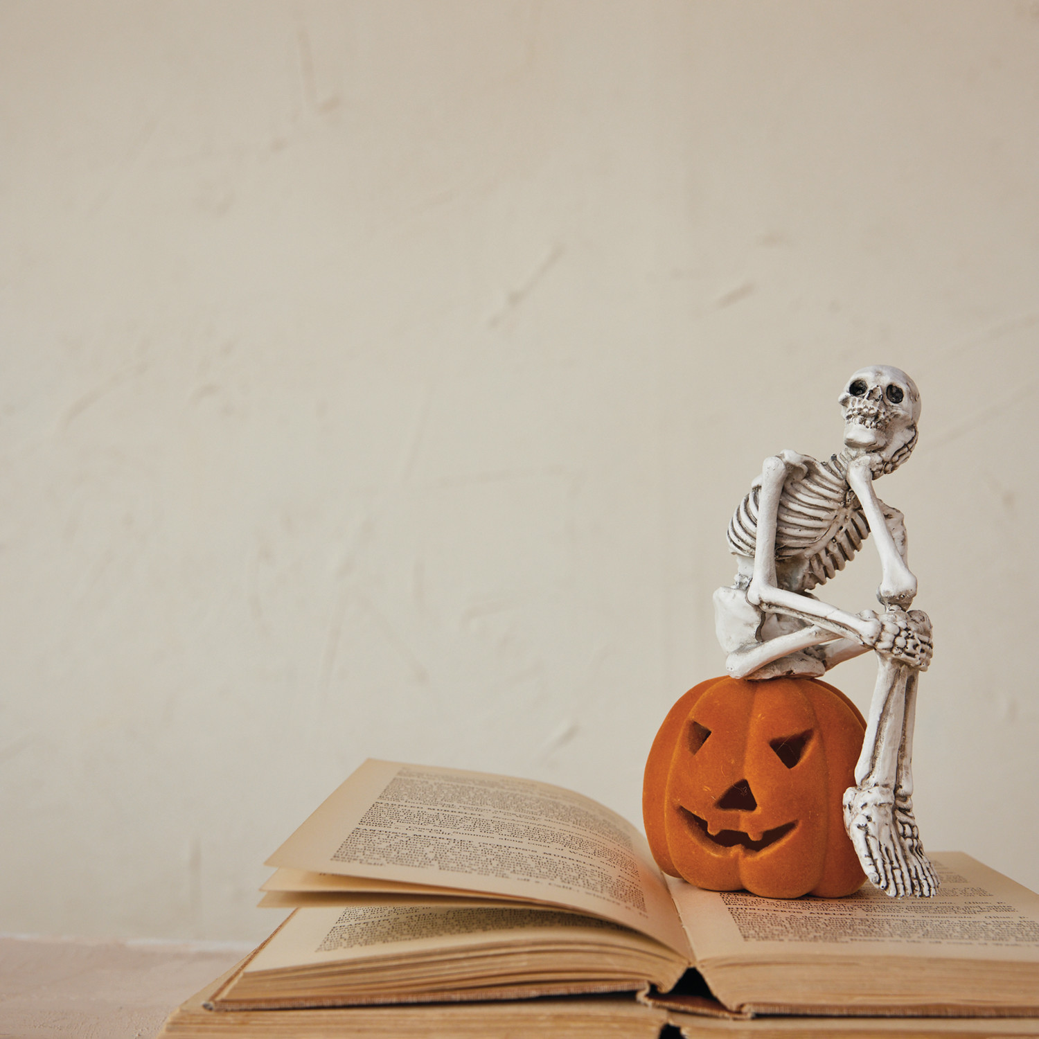 Resin Skeleton Sitting on Flocked Jack-O-Lantern