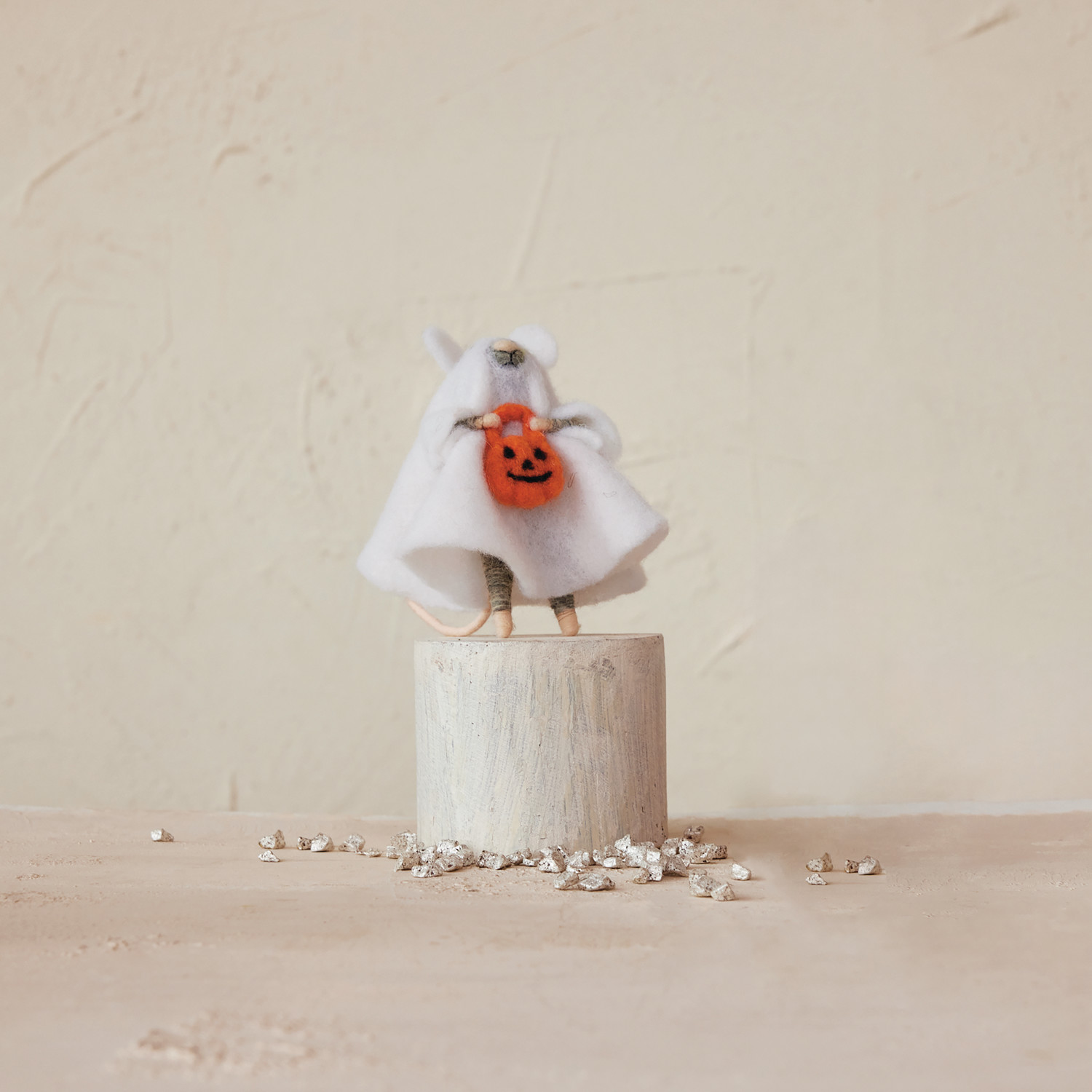 Handmade Fabric & Wool Felt Trick or Treating Mouse in Ghost Costume