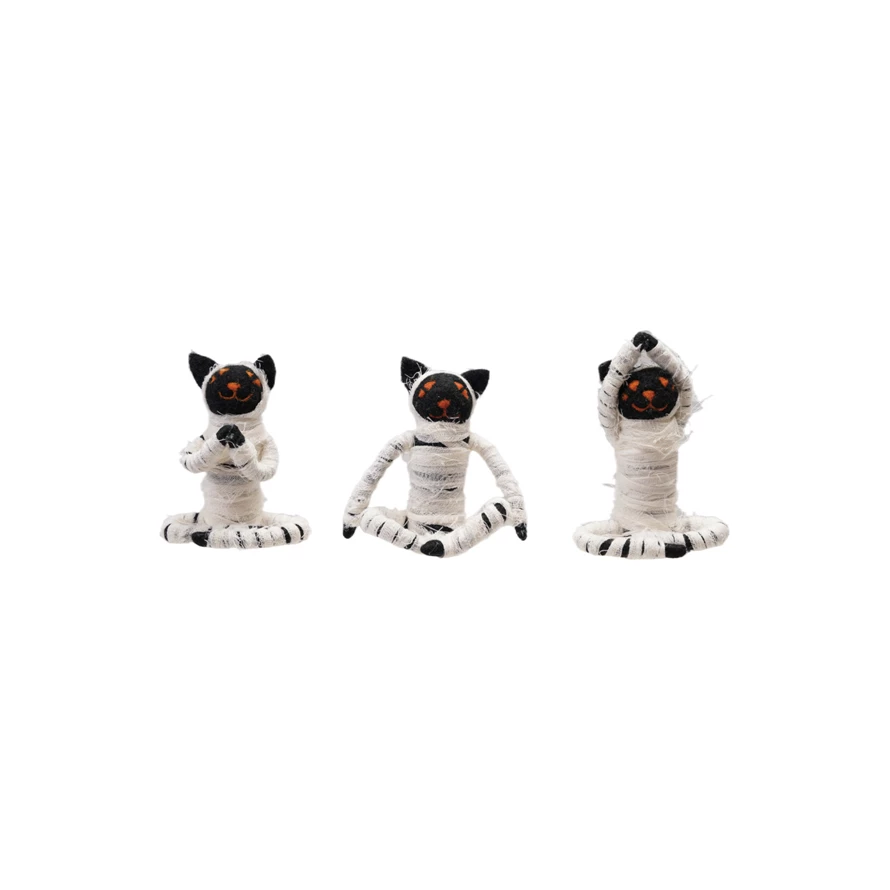 Catalog Name: 4"L x 2"W x 4-3/4"H Handmade Fabric & Wool Felt Yoga Cat in Mummy Costume, White, Black & Orange Color, 3 Styles