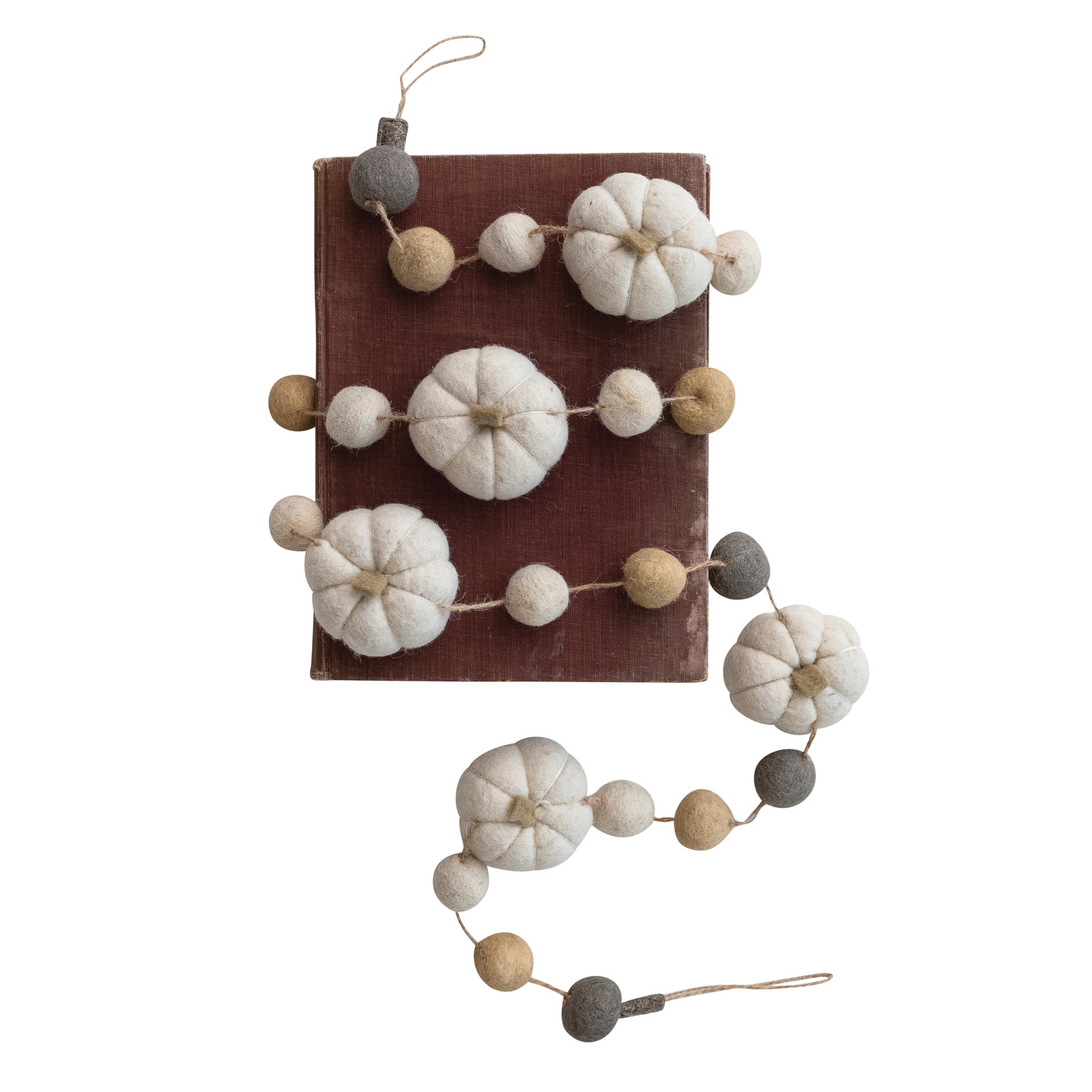 Handmade Wool Felt Pumpkin & Ball Garland with Jute Cord, Cream, Tan Color & Grey