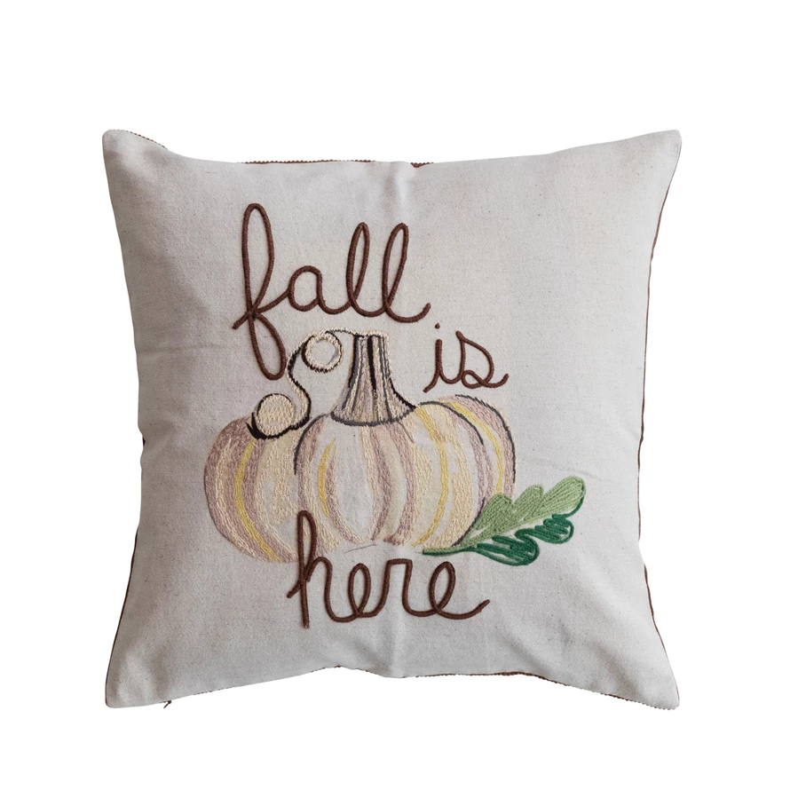 Catalog Name: 18" Square Cotton & Linen Printed Pillow w/ Pumpkin, Embroidery & Corduroy Back "Fall Is Here", Multi Color ©