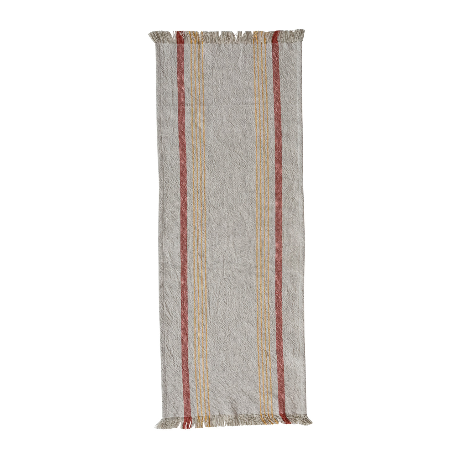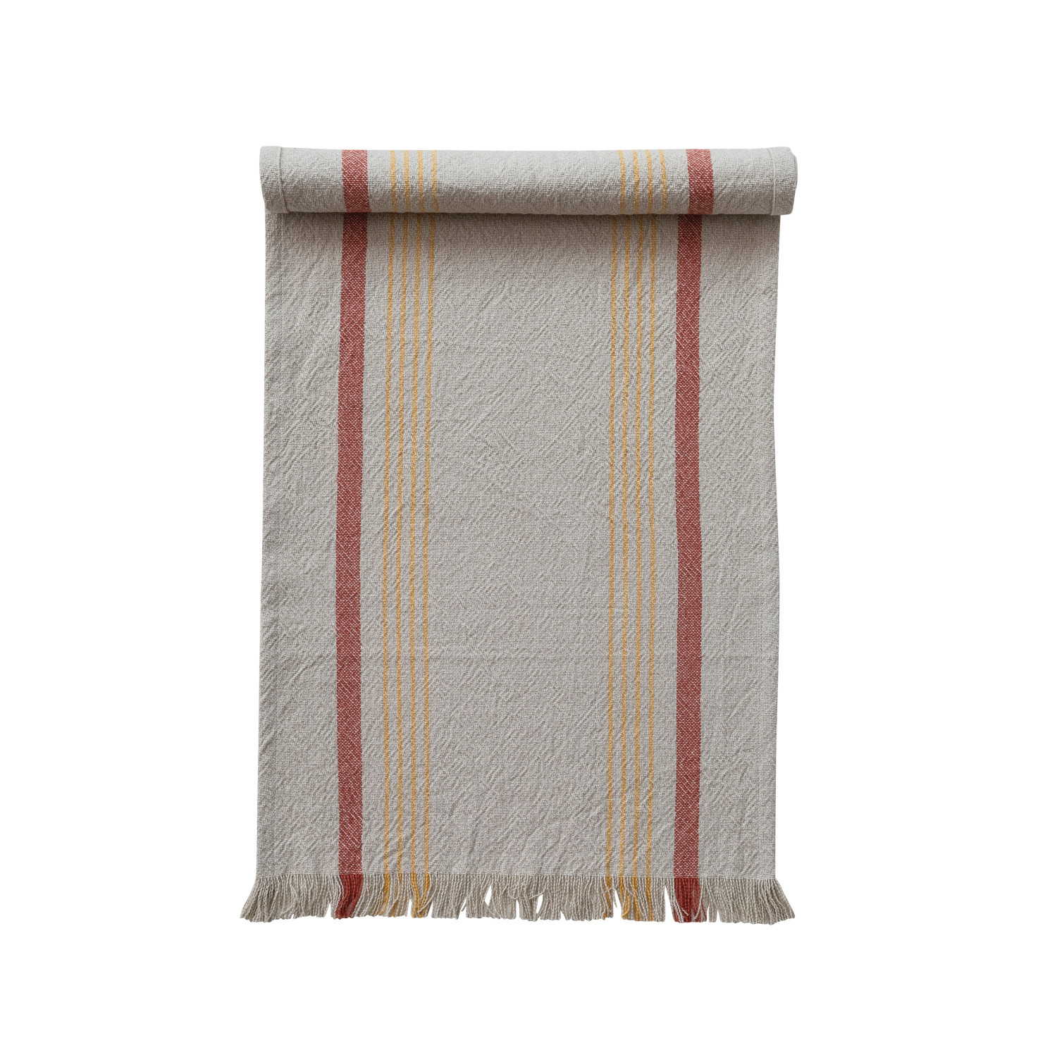 Woven Cotton Table Runner with Stripes & Eyelash Fringe, Roll Tied with Jute Cord