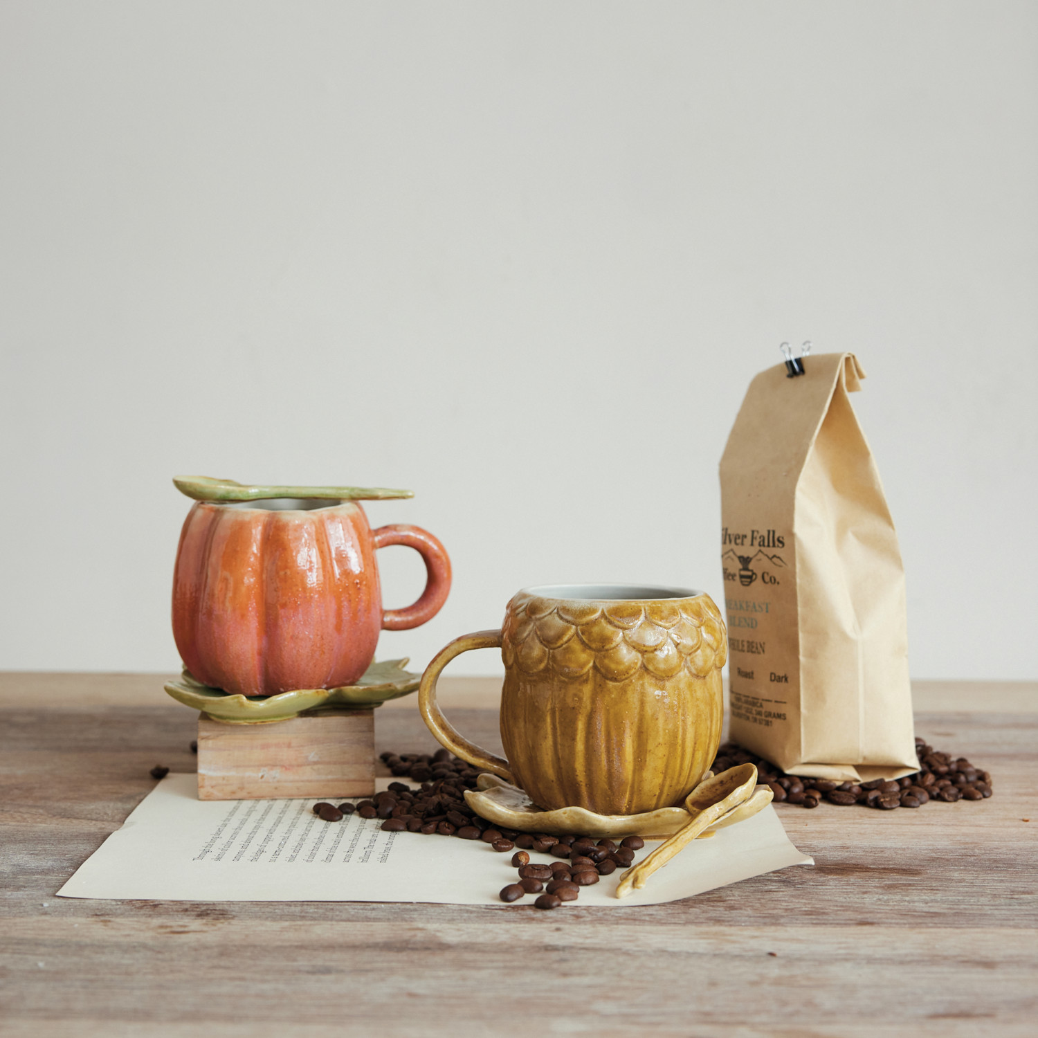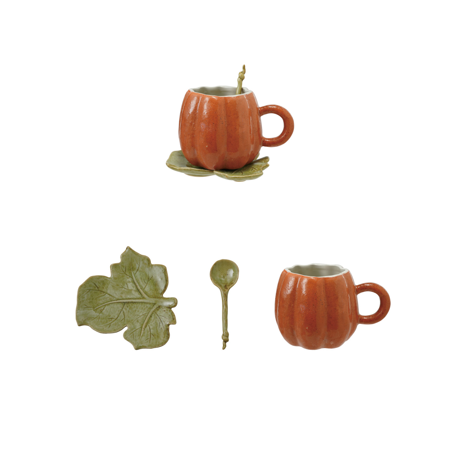 Catalog Name: 6"L x 5-1/4"W x 4-1/4"H 14 oz. Hand-Painted Stoneware Pumpkin Shaped Mug w/ Leaf Shaped Saucer & Spoon, Reactive Glaze, Orange Color & Green, Set of 3 (Each One Will Vary)