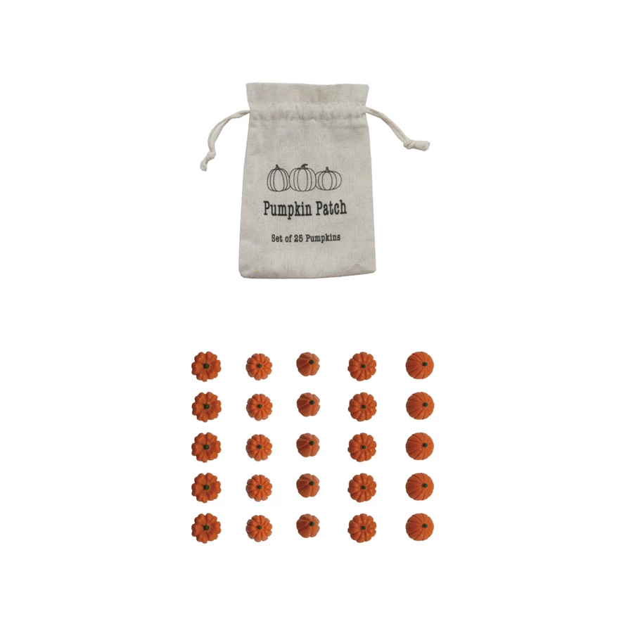 Catalog Name: Approximately 1/2"H Resin Pumpkins in Printed Drawstring Bag, Orange Color, Set of 25