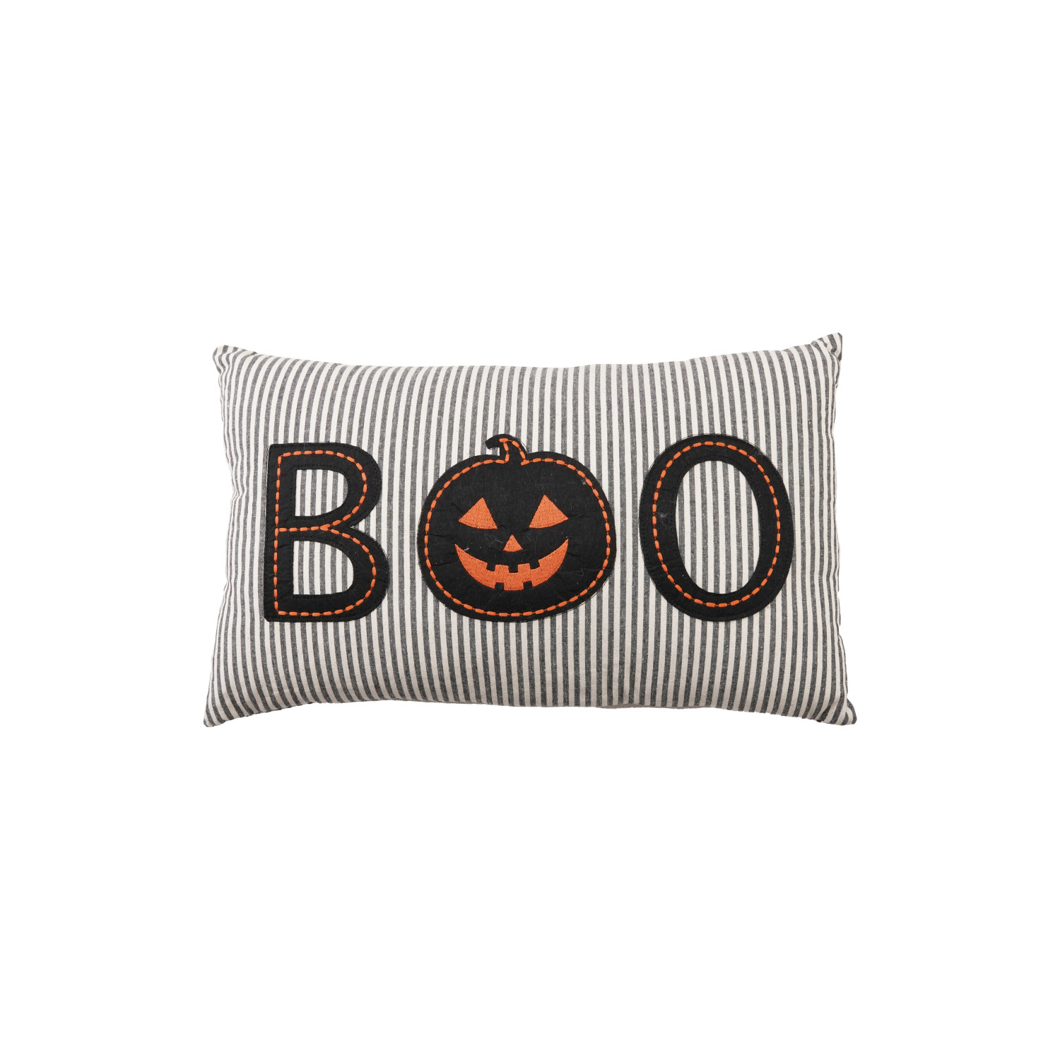 Cotton Striped Lumbar Pillow with Jack-O-Lantern & Appliqued "BOO"