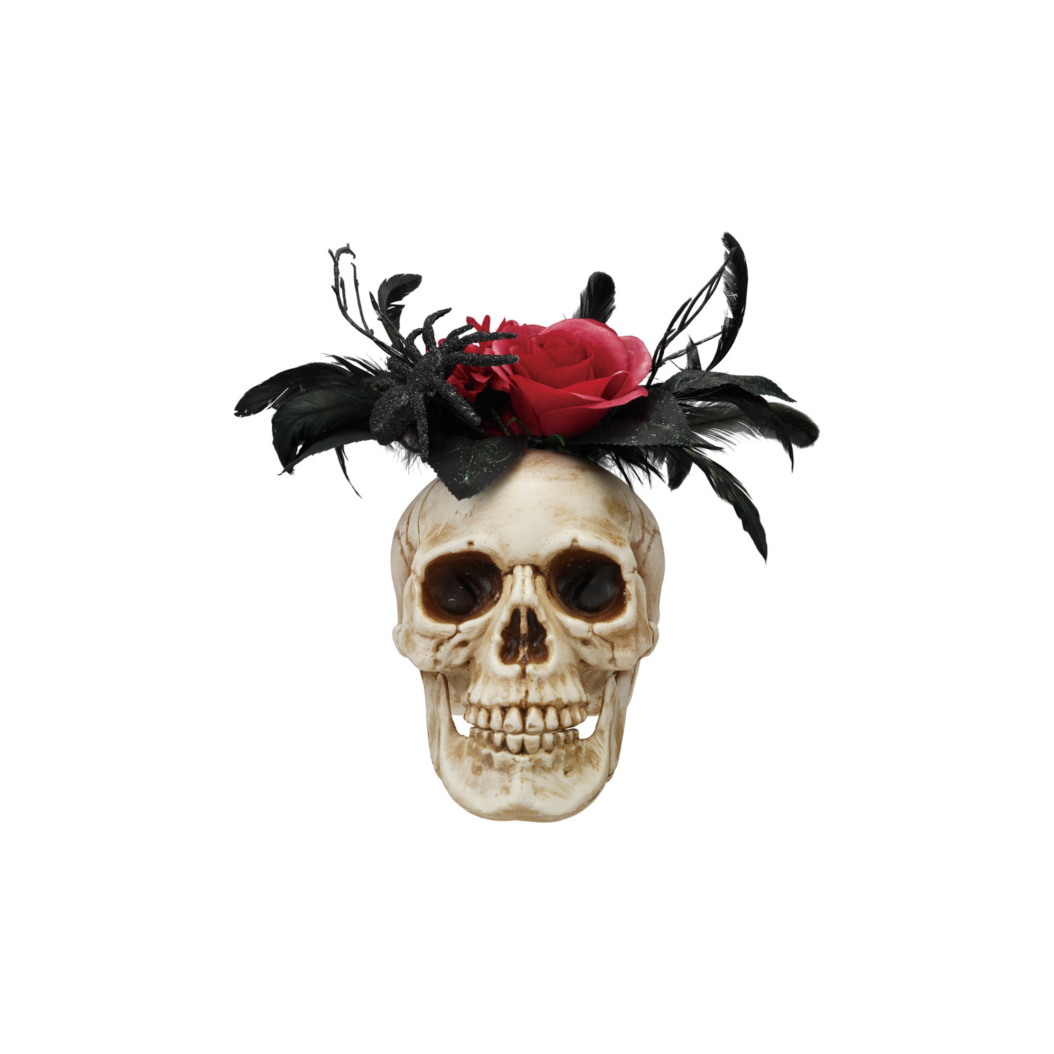 Catalog Name: 10"L x 9-1/2"W x 12"H Plastic Skull Décor w/ Faux Flowers, Feathers & Spider, Bone Finish, Black & Red