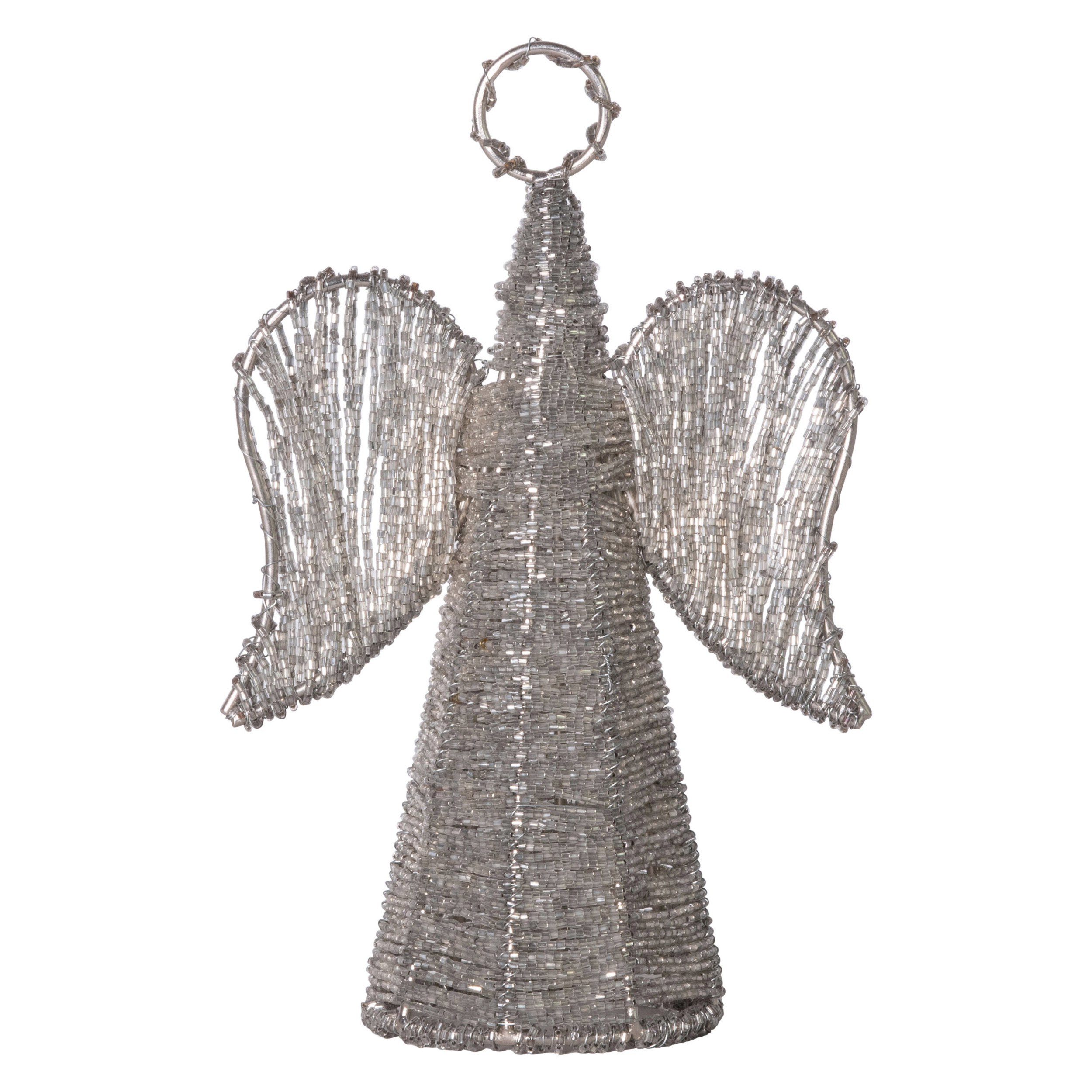 This metal angel figurine covered with silver beads can be the perfect addition to this season's holiday decor. Place on a table or shelf or add it to a centerpiece for a bit of extra flair. Mingle with other holiday figurines like a snowman, Santa or miniature buildings.