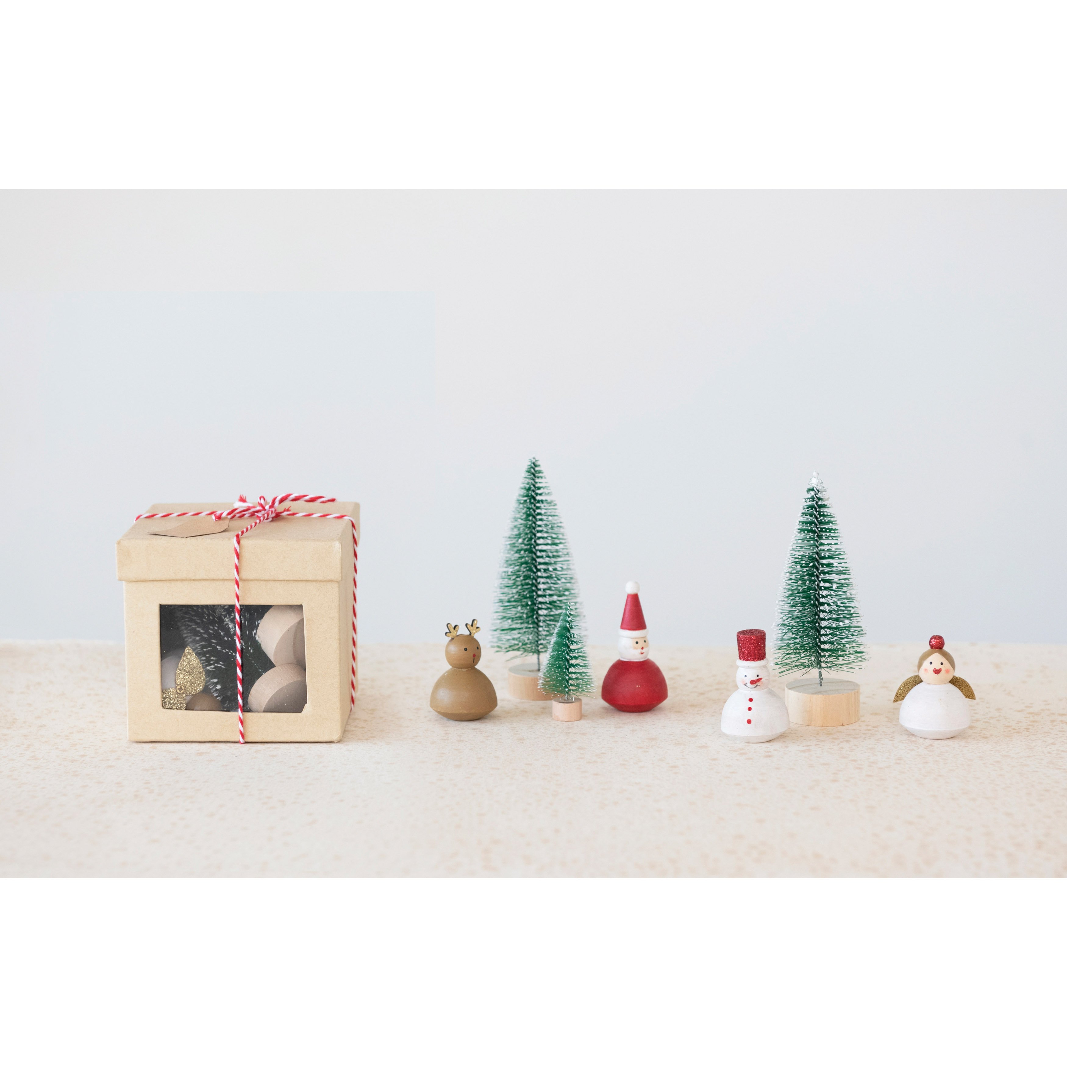 Catalog Name: 1-3/4"H - 5"H Hand-Painted Wood Christmas Figures & Plastic Bottle Brush Trees w/ Wood Bases, Multi Color, Boxed Set of 7