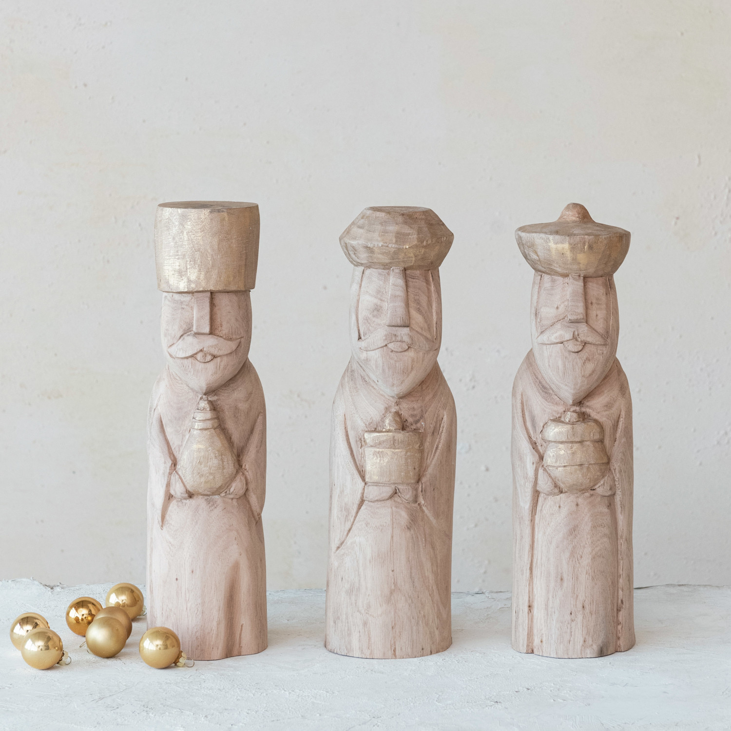 Catalog Name: 4" Round x 15"H Hand-Carved Mango Wood Wise Men, Natural & Rubbed Gold Finish, 3 Styles