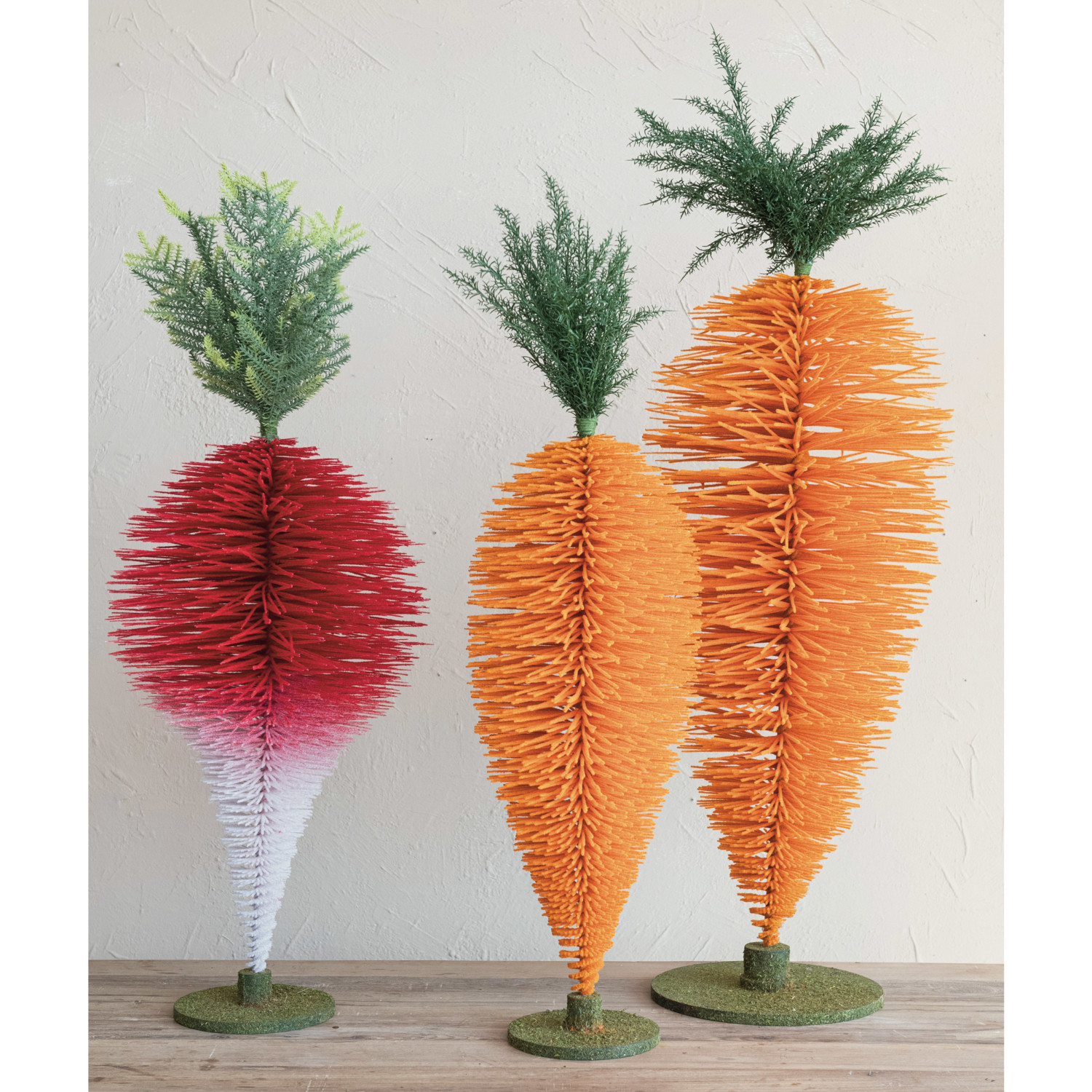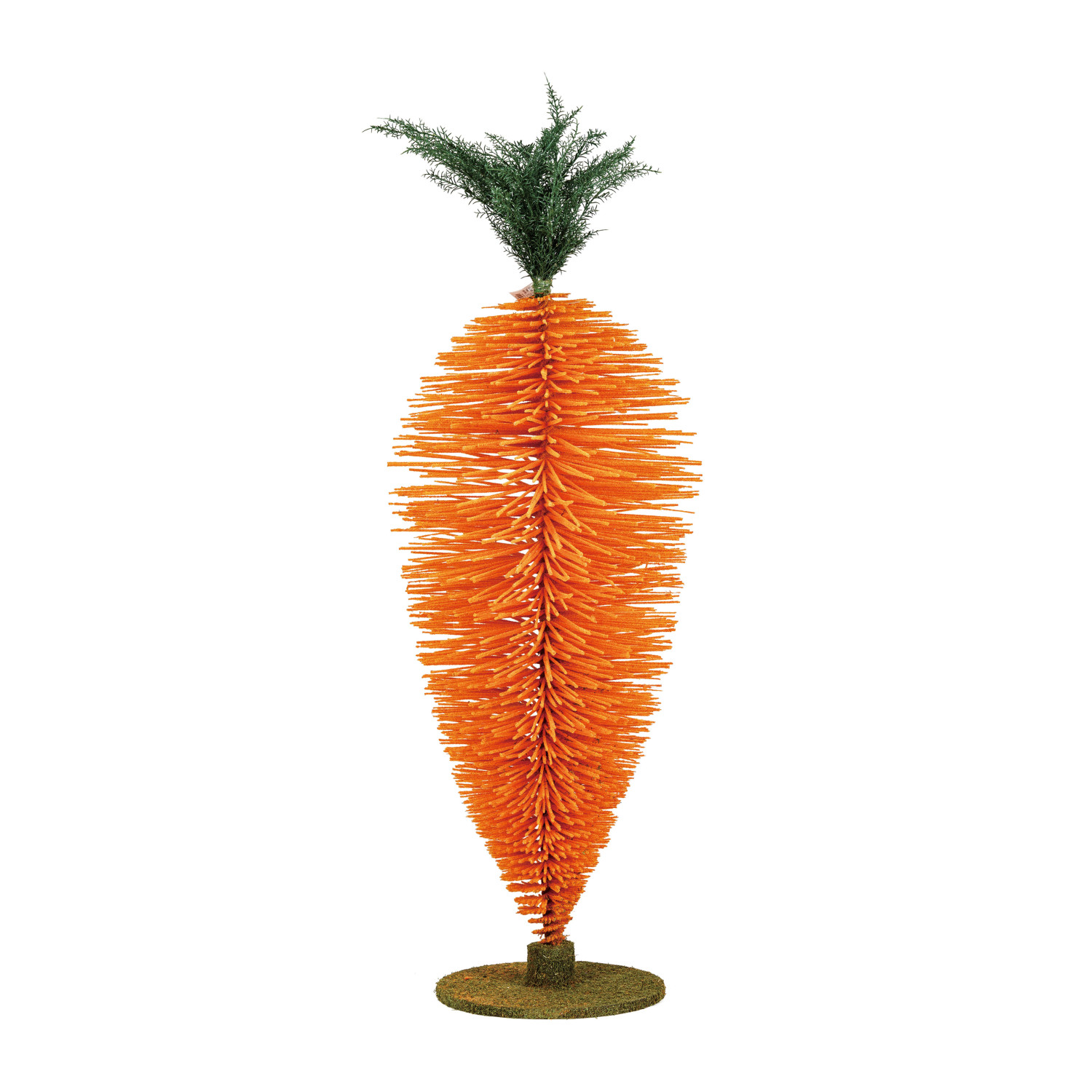 Catalog Name: 54-1/2"H Flocked Bottle Brush Standing Carrot w/ Faux Moss Finish MDF Base, Green & Orange Color