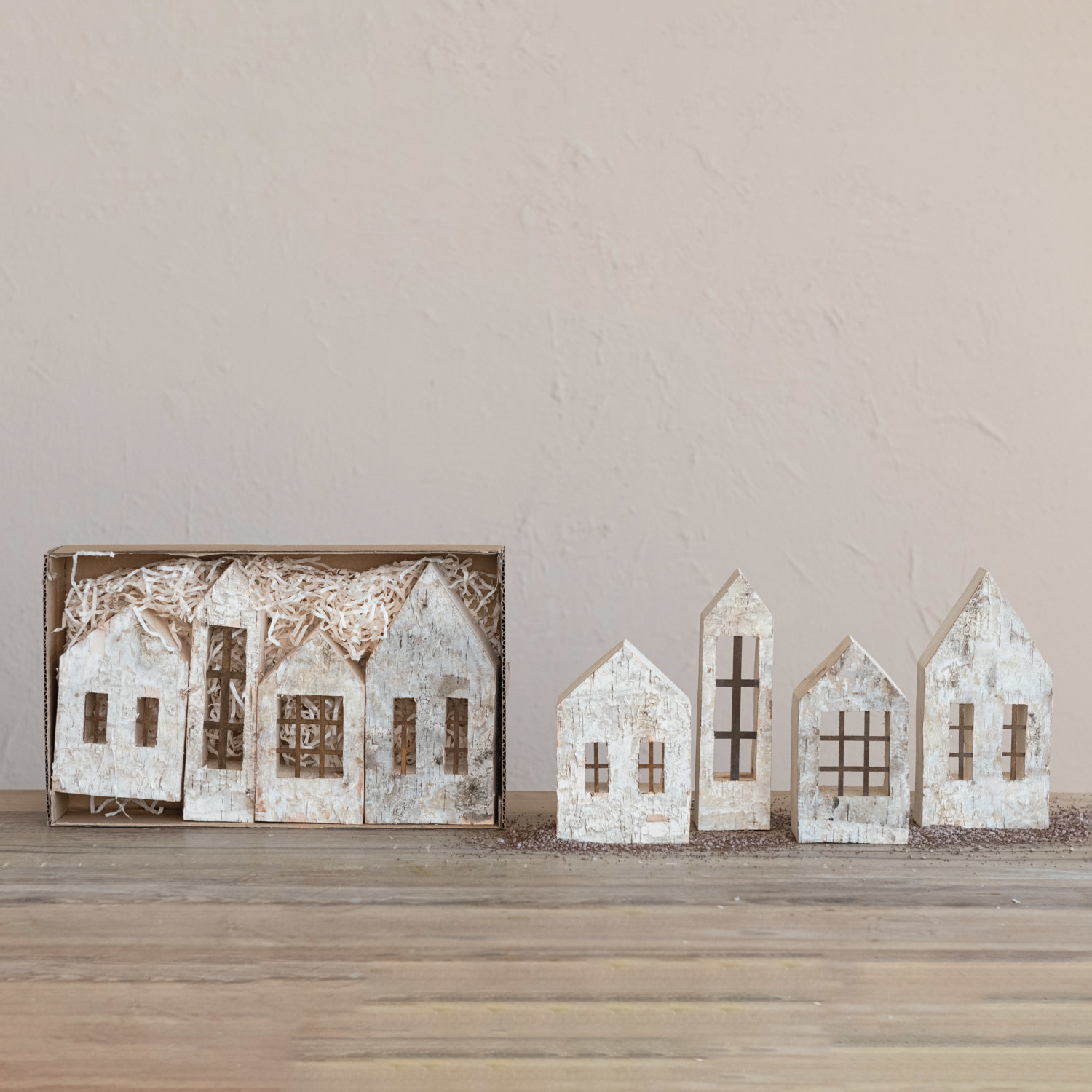 Catalog Name: 6"H - 8"H Birch Bark Houses w/ Windows, Natural, Boxed Set of 4