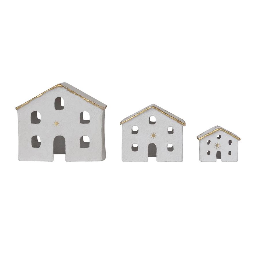 Paper Mache Houses with Gold Foil Stars & Trim, White, Set of 3