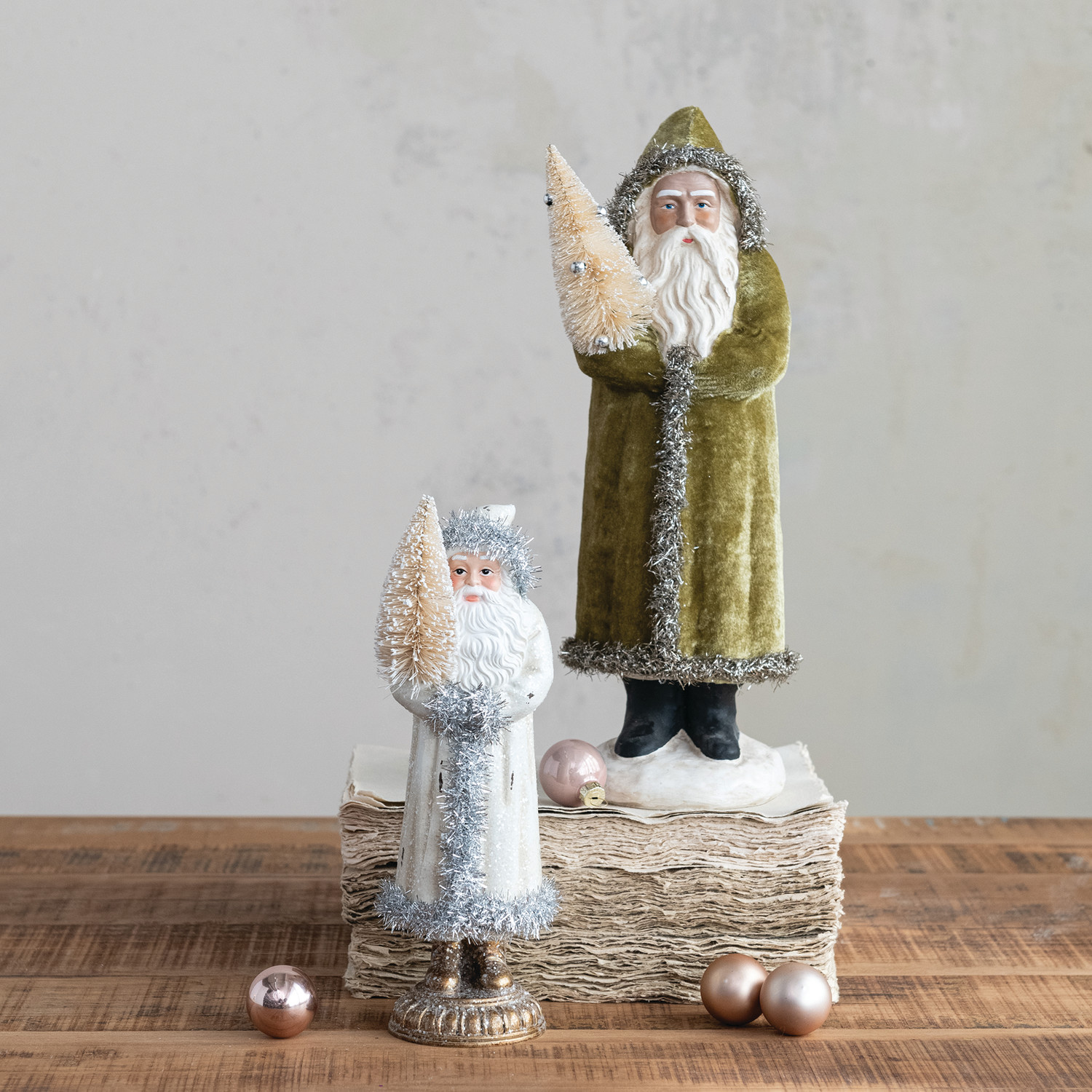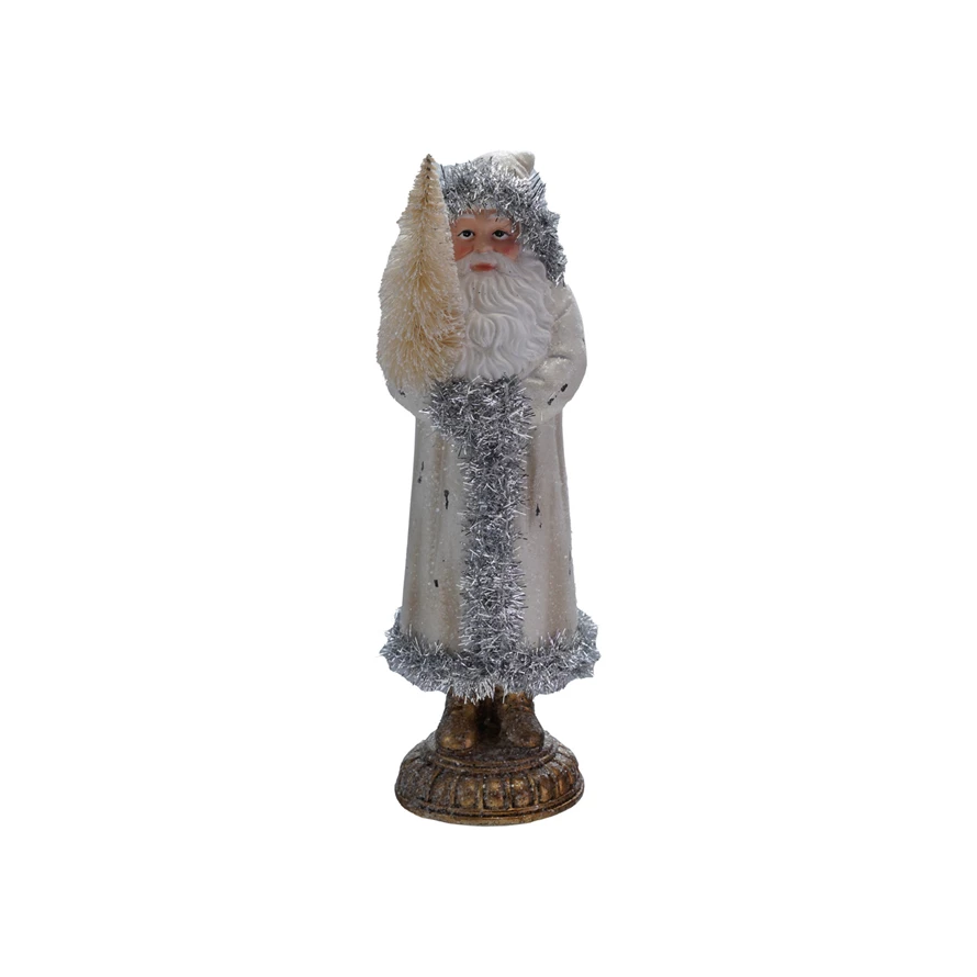 Catalog Name: 3" Round x 10"H Resin Santa w/ Tinsel & Bottle Brush Tree, Cream Color & Nickel Finish