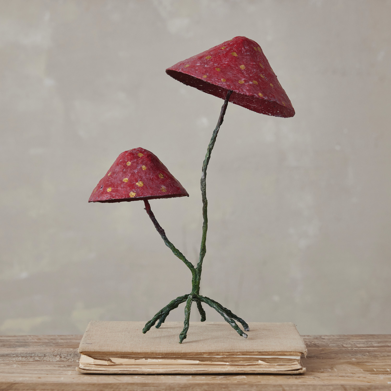 Handmade Paper Mache & Metal Mushrooms with Dots on Footed Stand