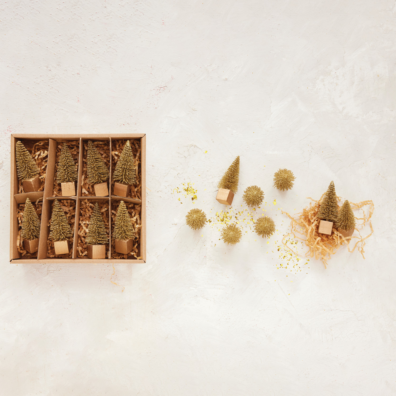 Catalog Name: 3-1/2"H Plastic Bottle Brush Trees w/ Wood Bases, Gold Glitter Finish, Boxed Set of 8