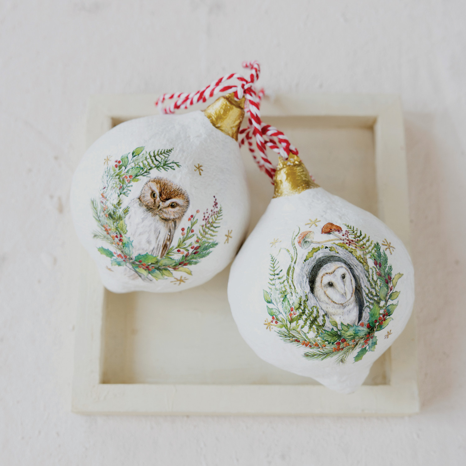 Metal & Paper Mache Ornament with Owl & Seasonal Botanicals, 2 Styles ©