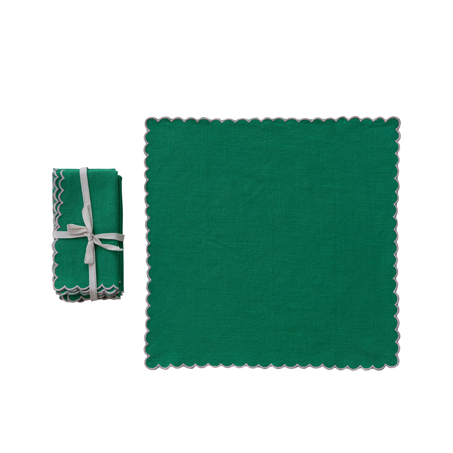 Catalog Name: 18" Square Cotton Scalloped Napkins w/ Contrasting Stitched Edges, Green & Pink, Set of 4 Tied w/ Cotton Tape