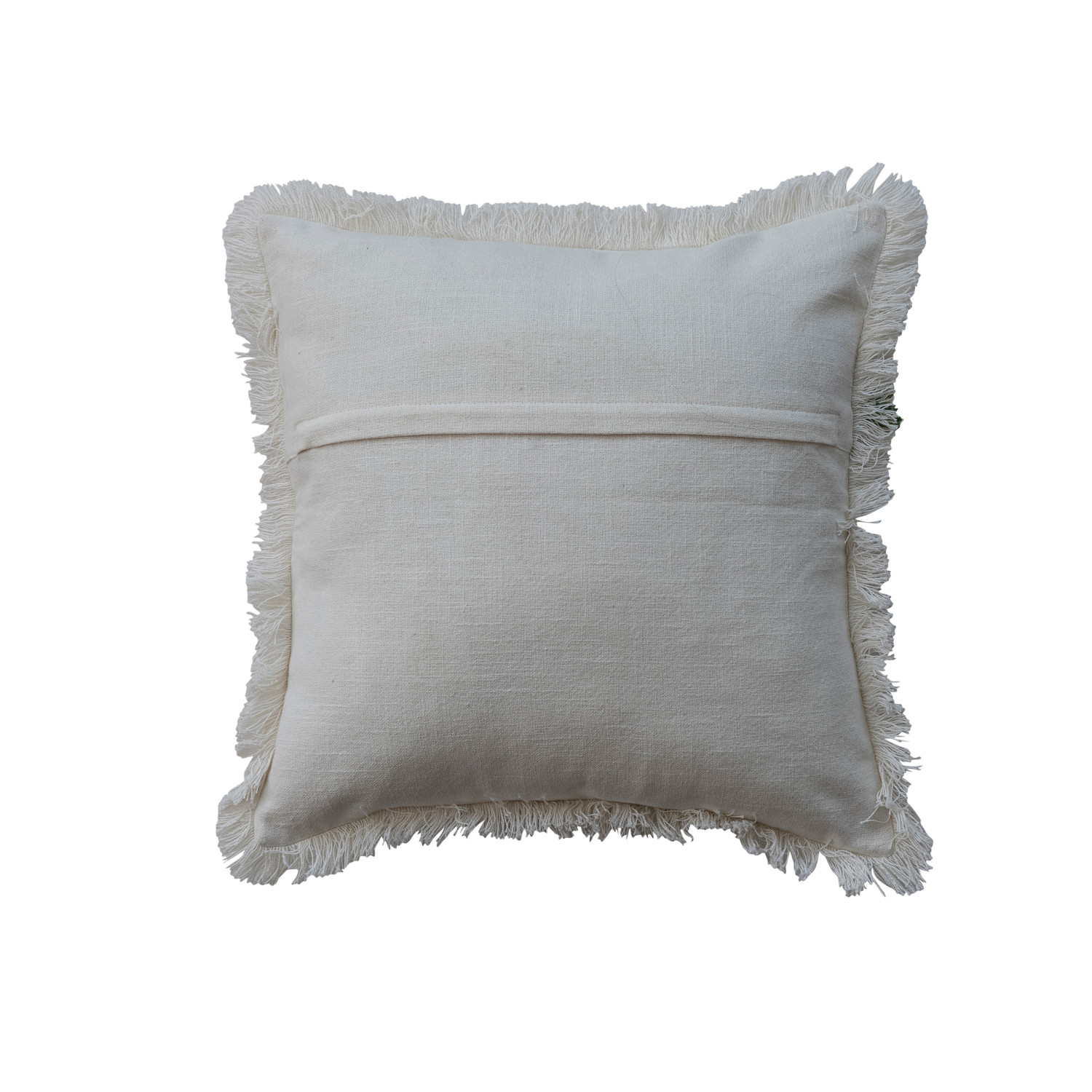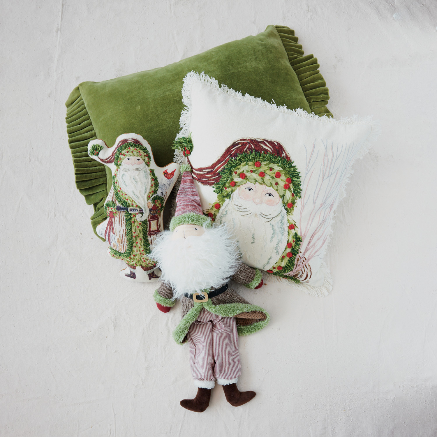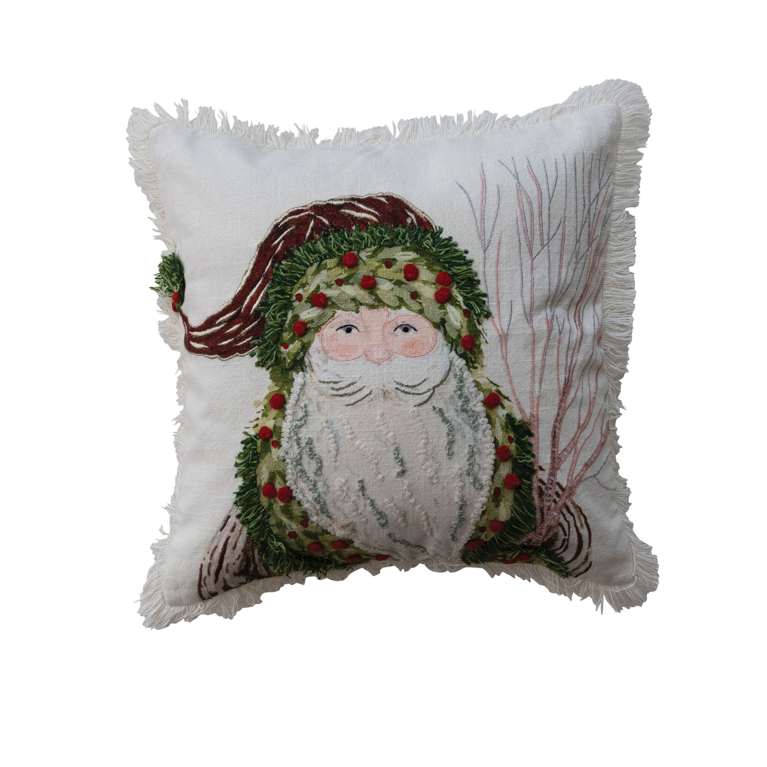 18" Square Cotton Slub Printed Pillow with Santa, Embroidery & Fringe ©