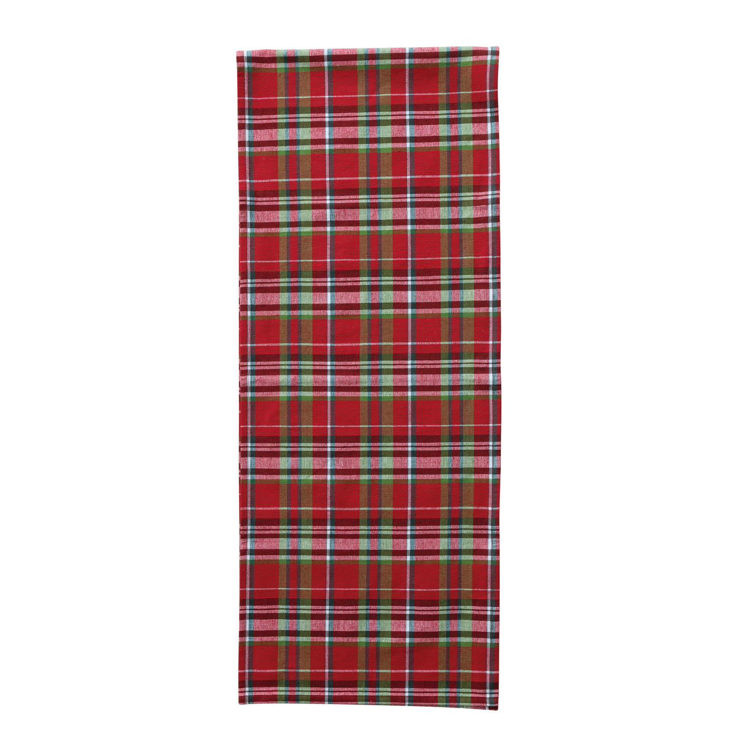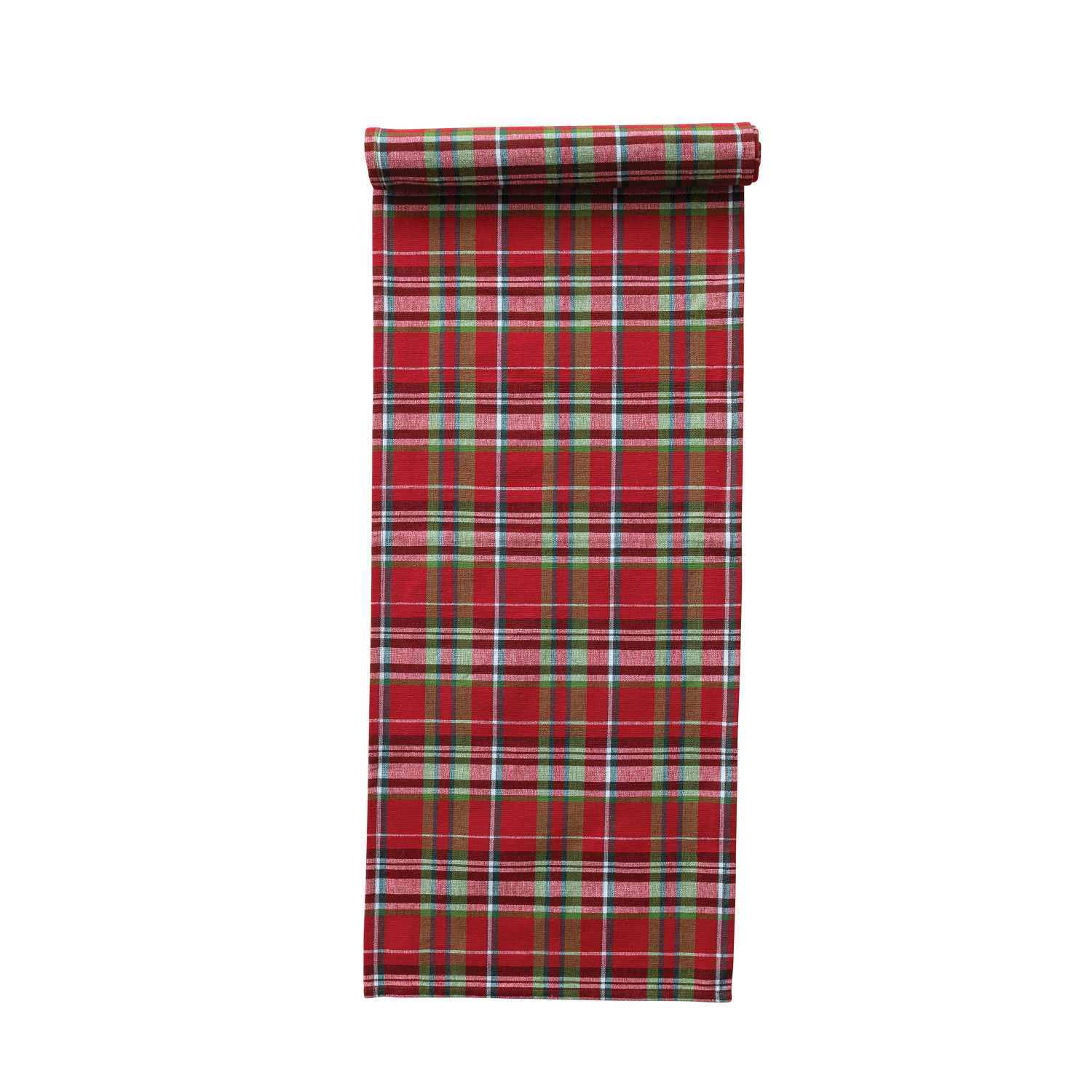 Catalog Name: 72"L x 14"W Woven Cotton Table Runner w/ Tartan Plaid Pattern, Multi Color, Roll Tied w/ Green Cotton Tape