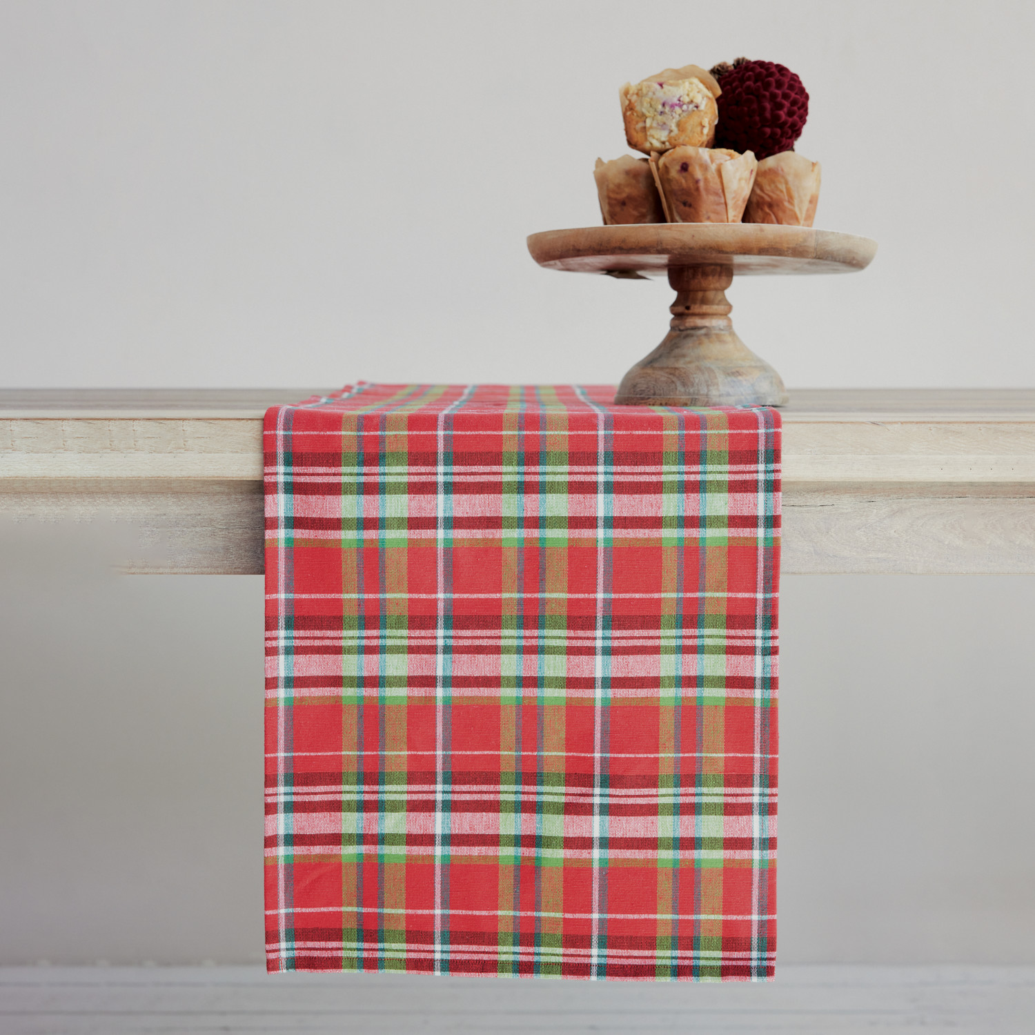 Woven Cotton Table Runner with Tartan Plaid Pattern, Roll Tied with Green Cotton Tape