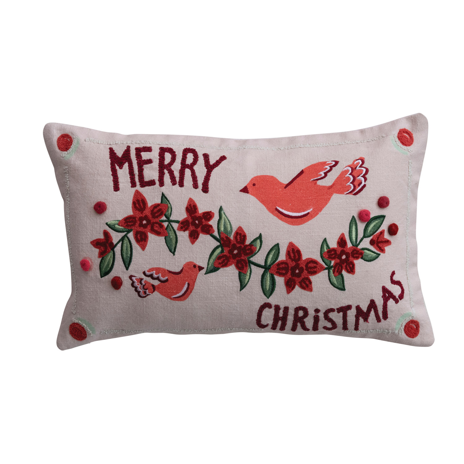 Catalog Name: 20"L x 12"H Cotton Slub Printed Lumbar Pillow w/ Birds, Poinsettias, Embroidery & Velvet Back "Merry Christmas", Multi Color ©
