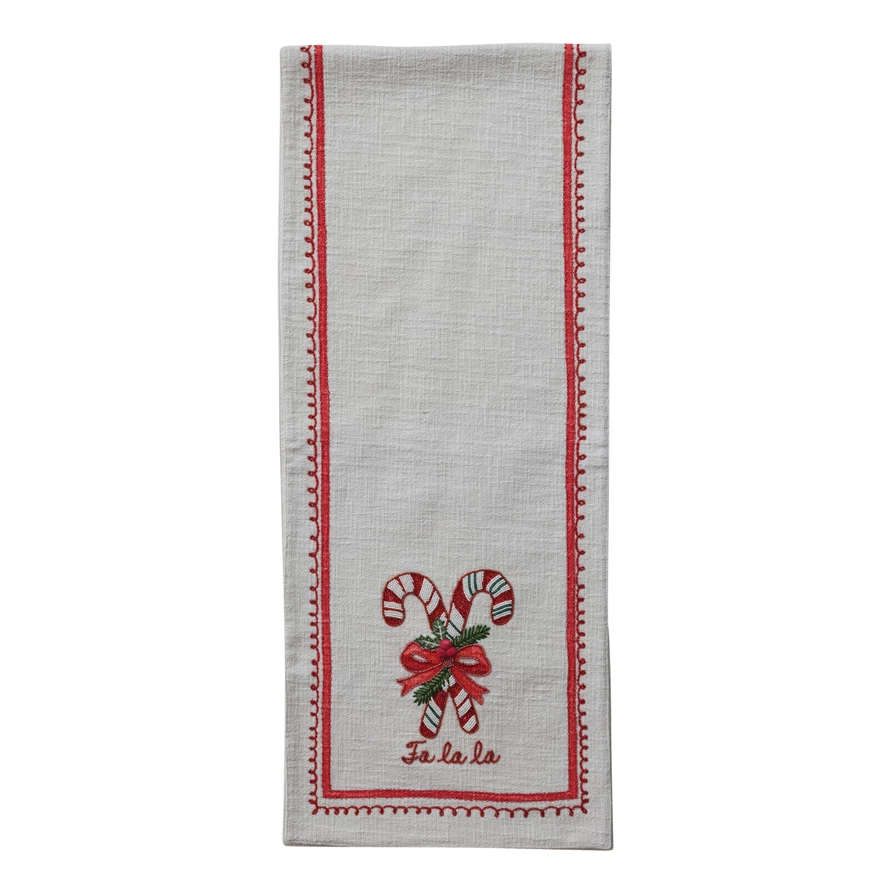 Catalog Name: 72"L x 14"W Cotton Slub Printed Table Runner w/ Embroidered Candy Canes, Bows, Holly Leaves & Beads "Fa La La", Ivory Color, Red & Green ©