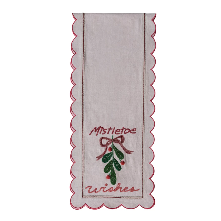 Catalog Name: 72"L x 14"W Cotton Printed Scalloped Table Runner w/ Mistletoe, Bows, Embroidery, Beads & Pom Poms "Mistletoe Wishes", Pink, Red & Green ©