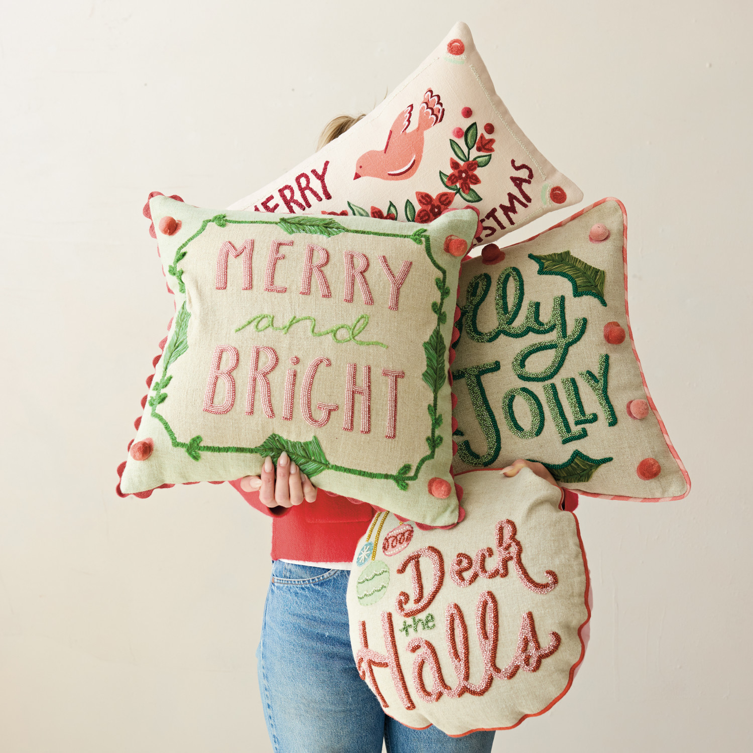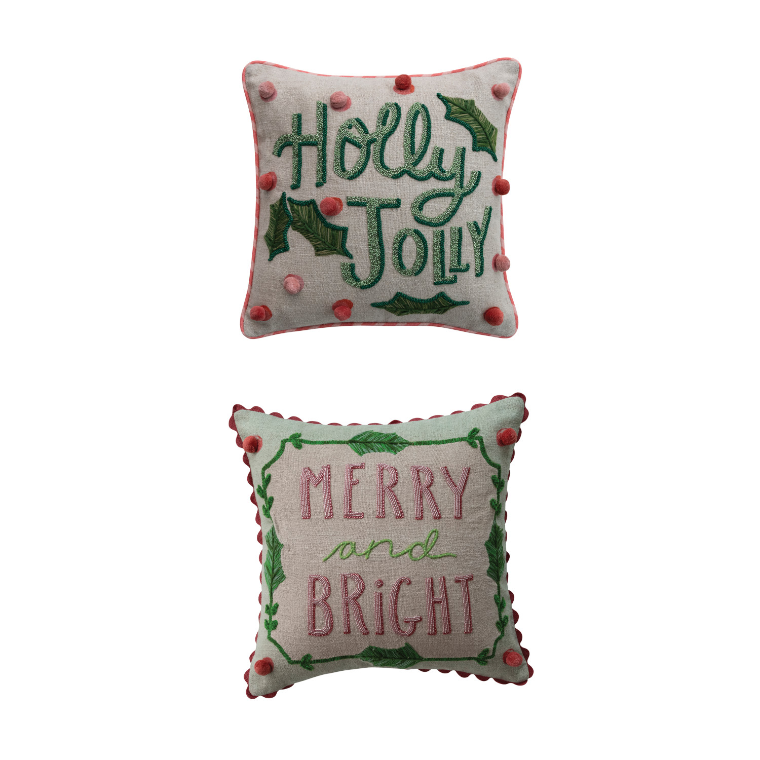 Catalog Name: 18" Square Linen Printed Pillow w/ Saying, Embroidery, Beads, Pom Poms & Ric Rac Trim, Multi Color, 2 Styles ©