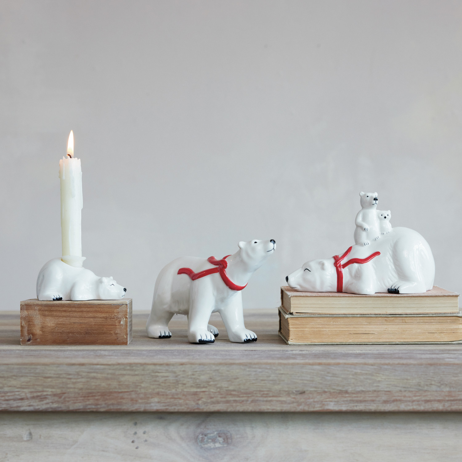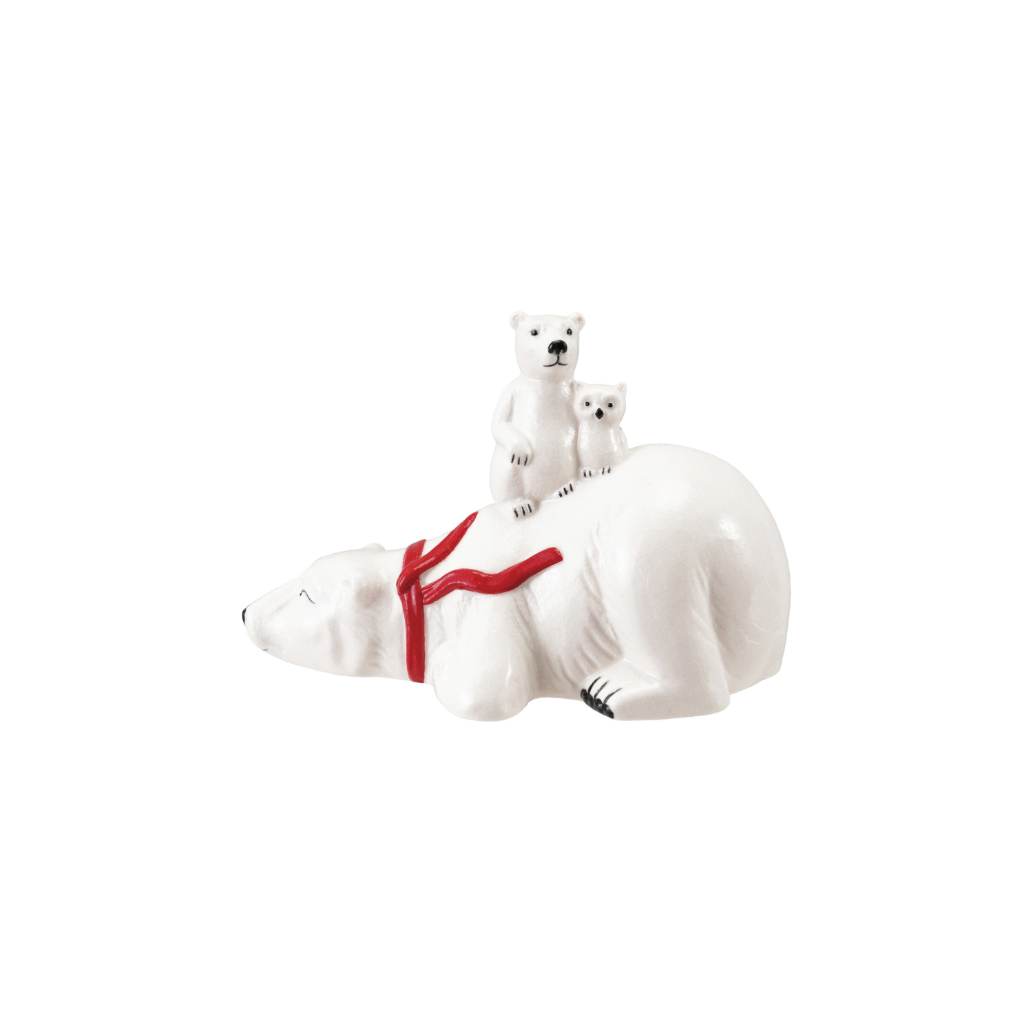 Stoneware Polar Bear with Scarf, Cub & Owl, White, Red & Black
