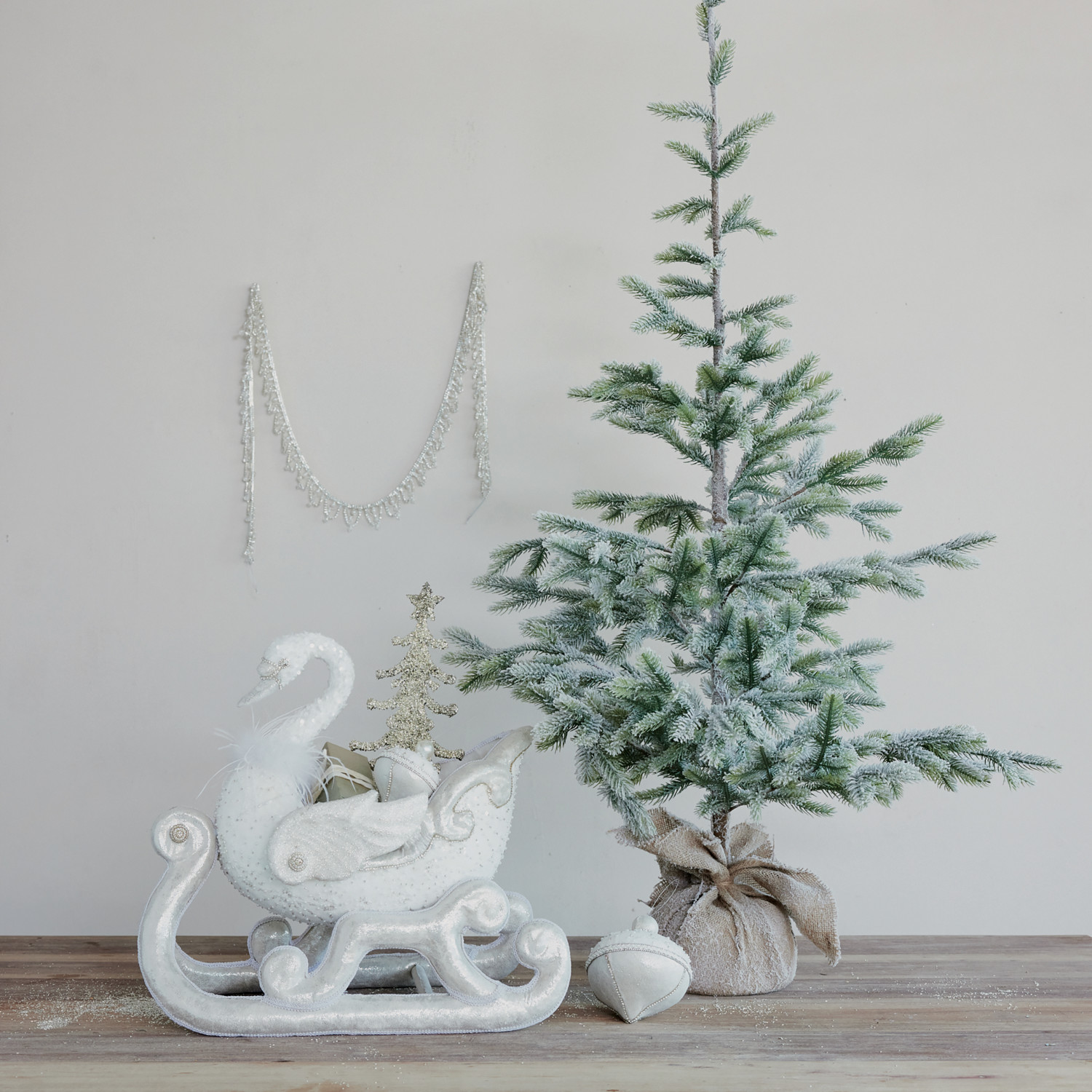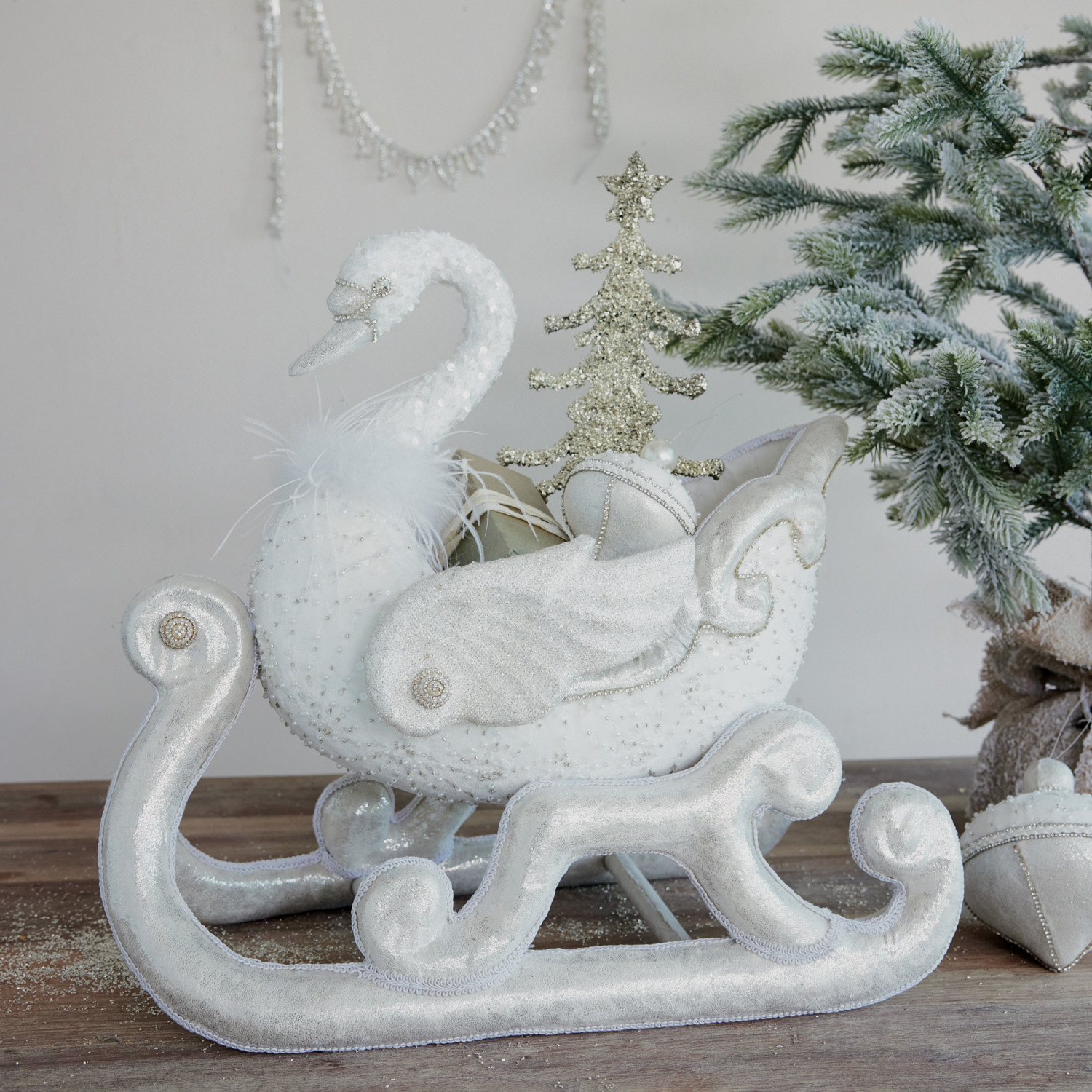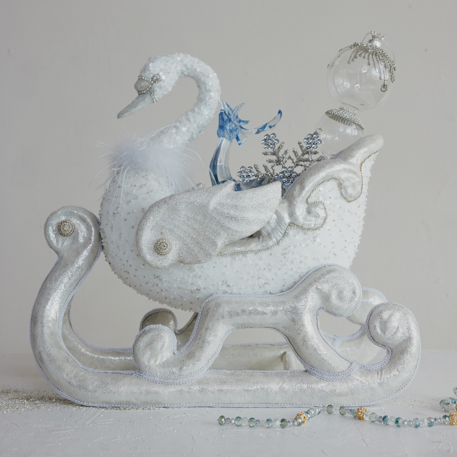 Catalog Name: 20-1/2"L x 12-1/2"W x 20-1/2"H Foam & Fabric Swan Shaped Sleigh w/ Glitter, Sequins & Feathers, White, Truck Ship