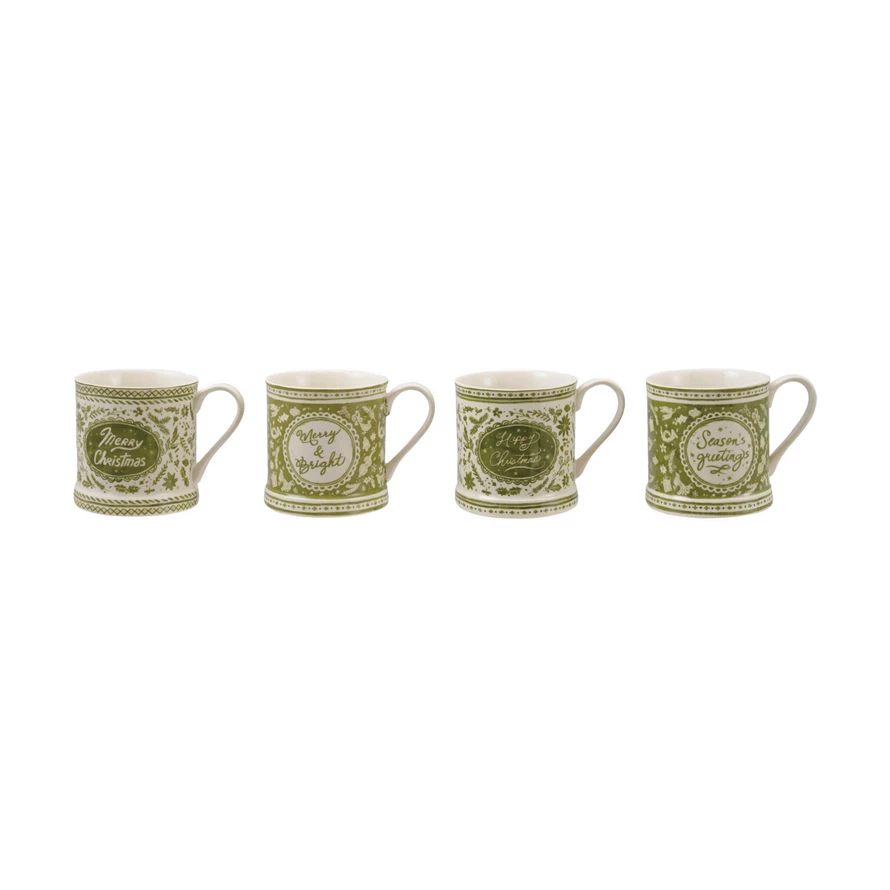 Catalog Name: 3-1/2" Round x 3-1/2"H 12 oz. Stoneware Mug w/ Holiday Design & Saying, Green & Cream Color, 4 Styles ©