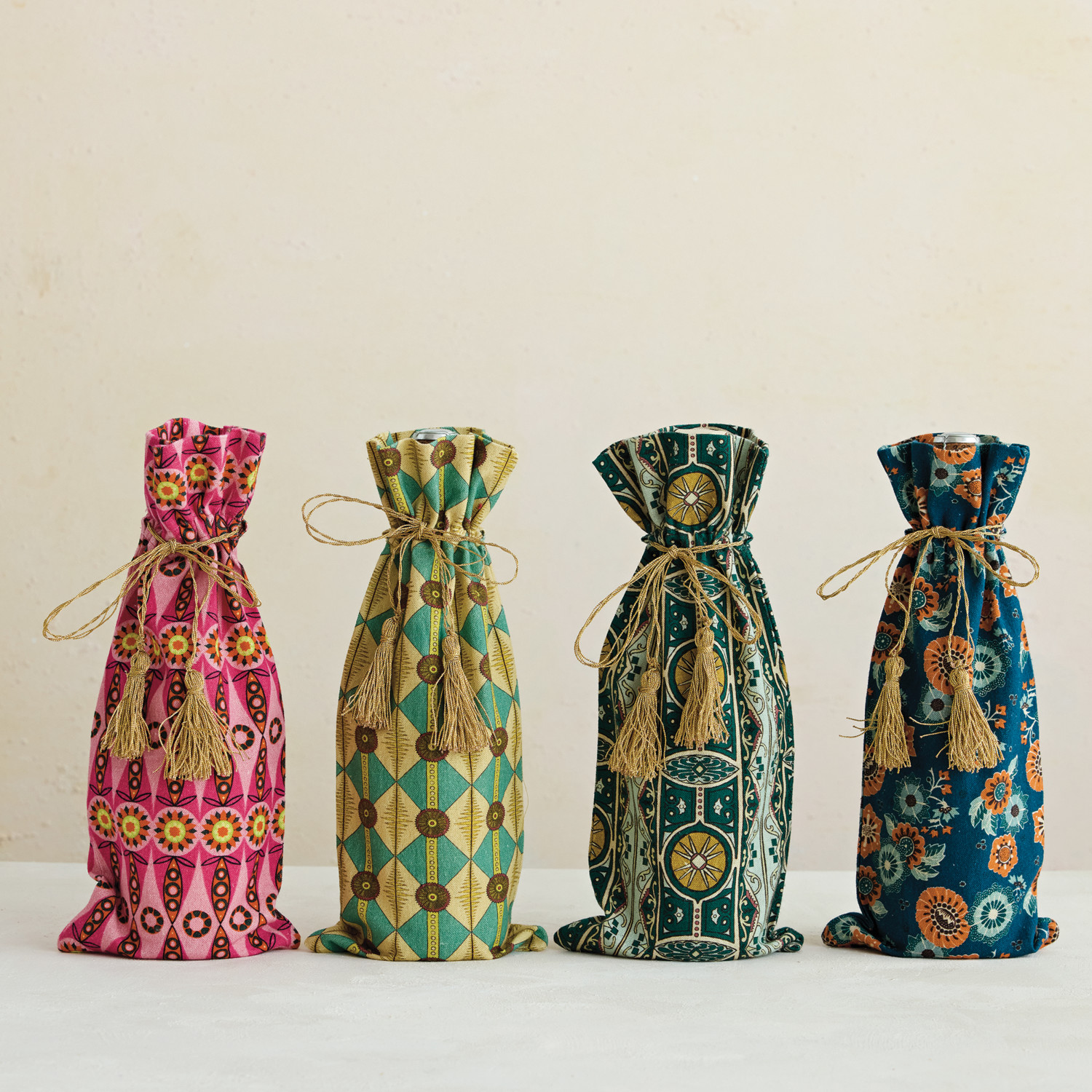 Catalog Name: 14"L x 6"W Cotton & Linen Printed Drawstring Wine Bag w/ Pattern, Gold Tie & Tassels, Multi Color, 4 Styles ©