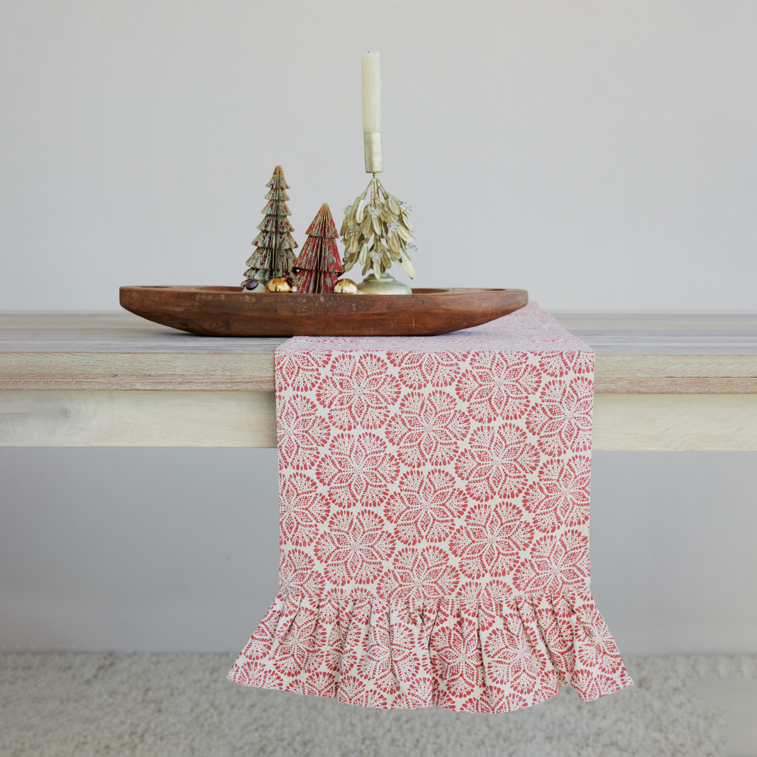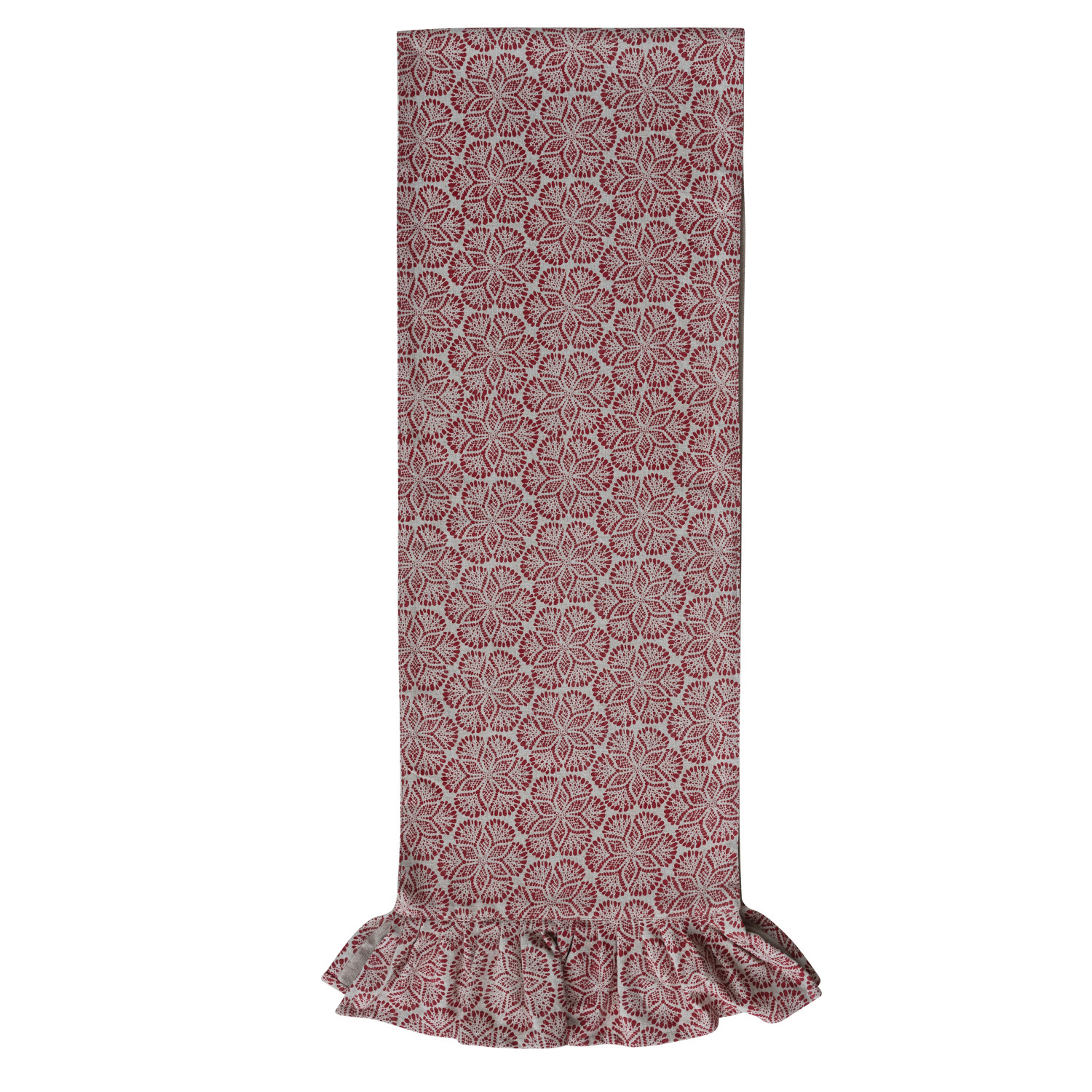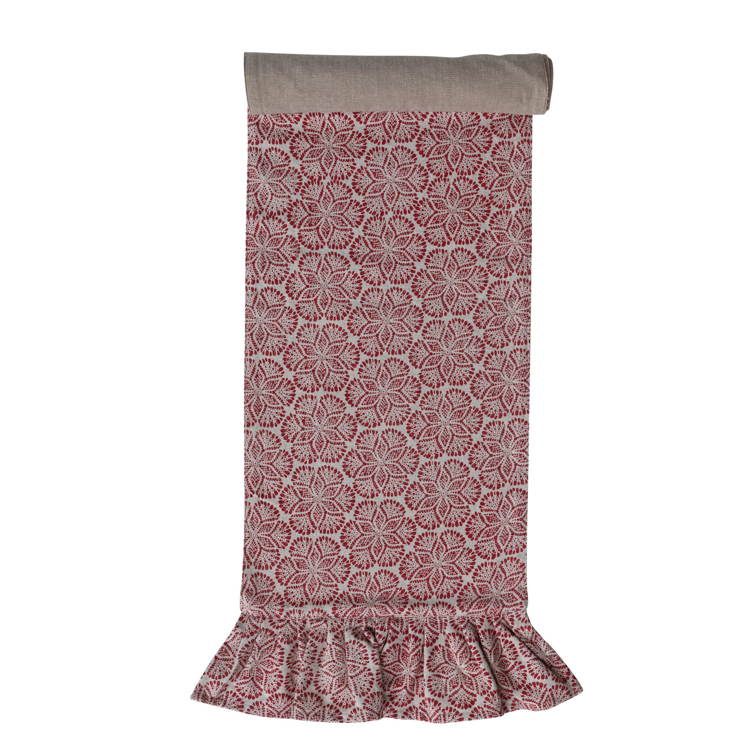 Fabric Blend Block Printed Table Runner with Pattern & Ruffle, Red & Natural