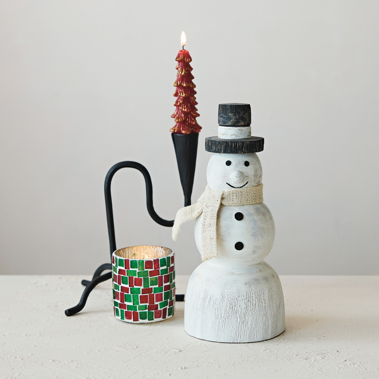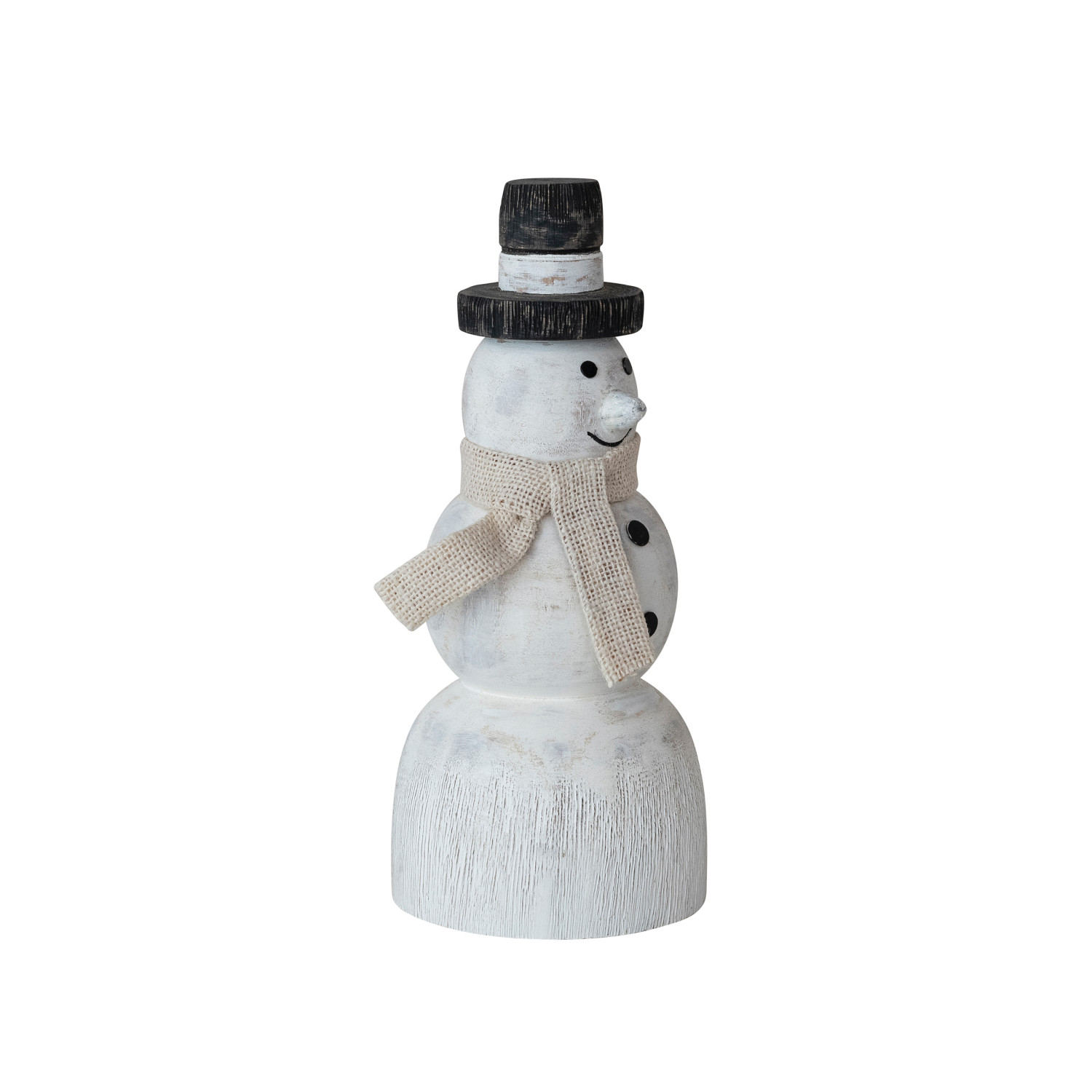 Catalog Name: 4-1/4" Round x 10-1/4"H Handmade Mango Wood Snowman w/ Top Hat & Scarf, White, Black & Natural