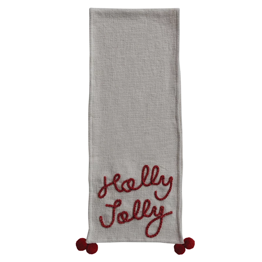 Cotton Slub Table Runner with Pom Poms & Embroidered "Holly Jolly"