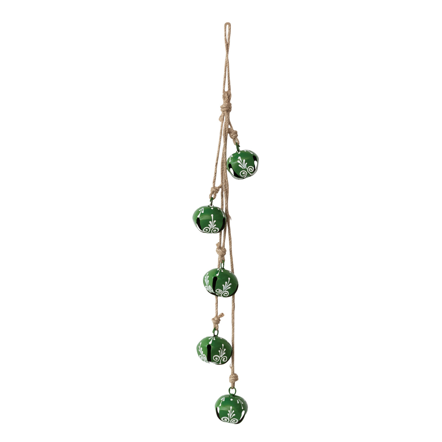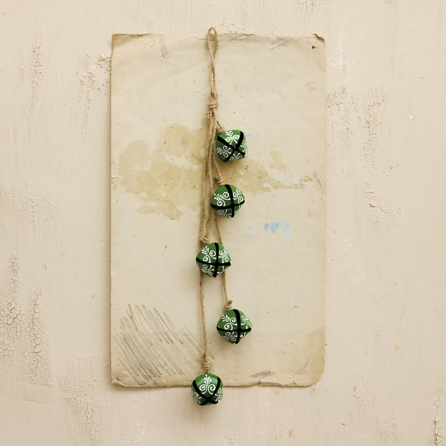 Hanging Hand-Painted Metal Jingle Bell Cluster with Design & Jute Hanger, Green & White