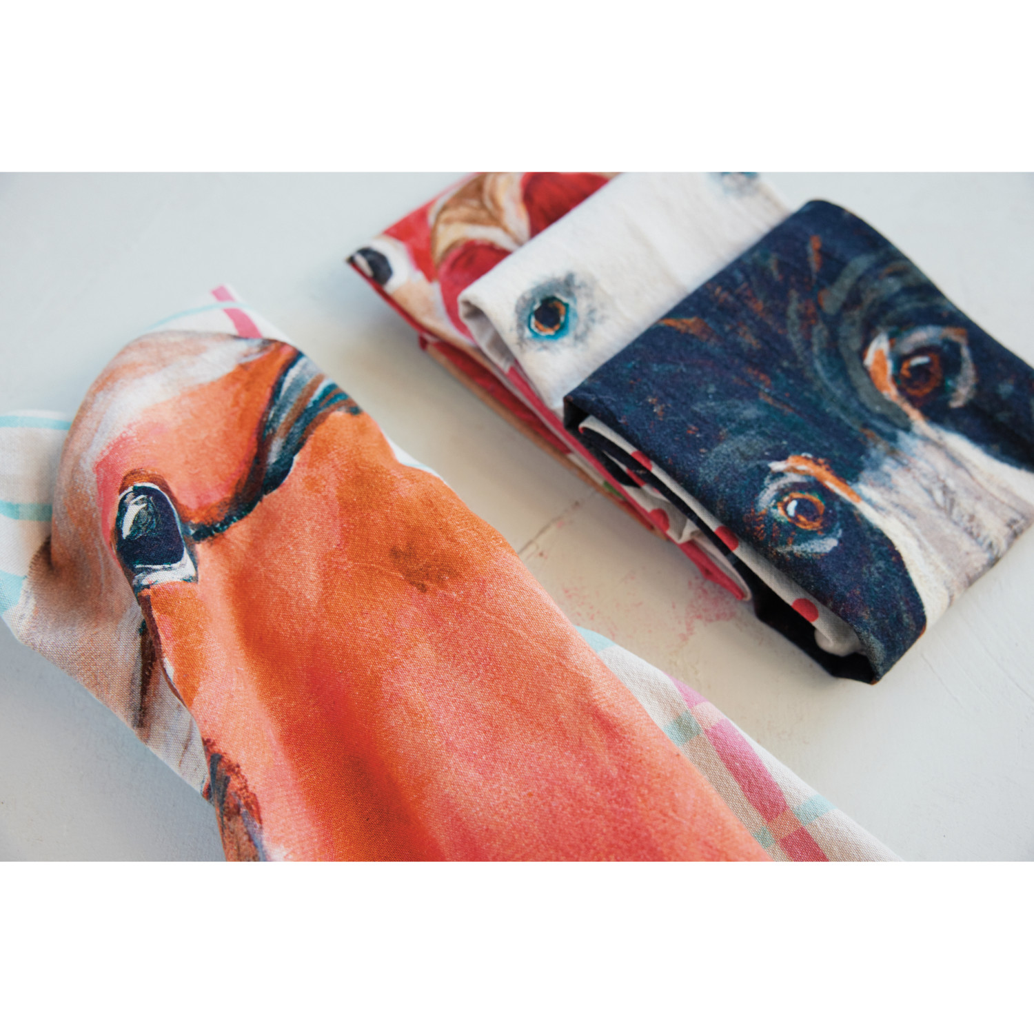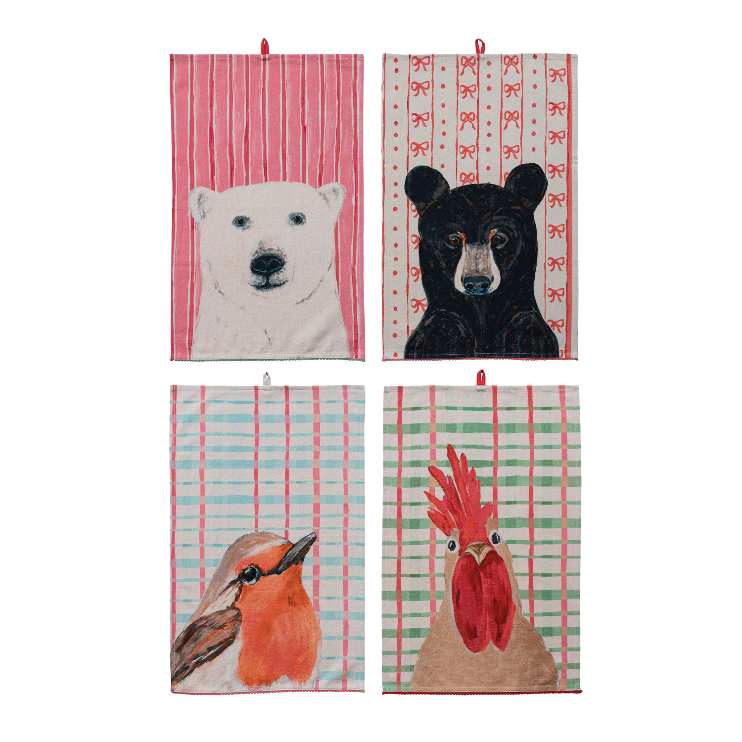 Cotton Chambray Printed Tea Towel with Holiday Pattern, Animal & Pom Pom Trim, 4 Styles ©